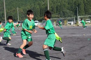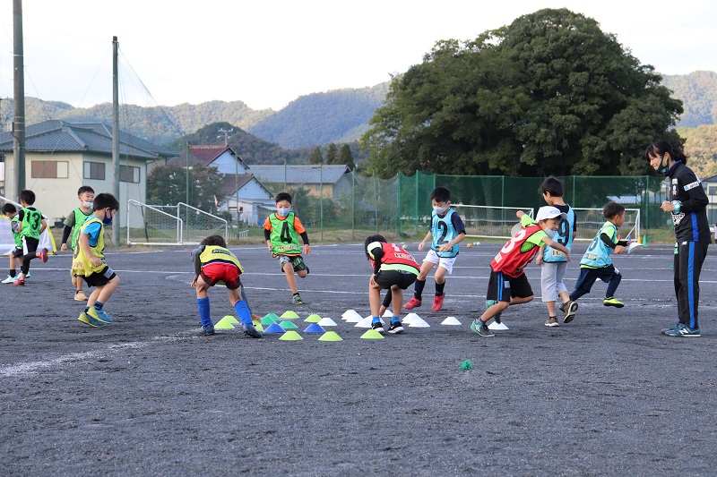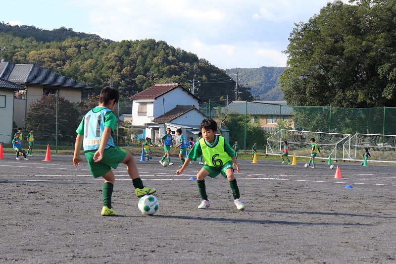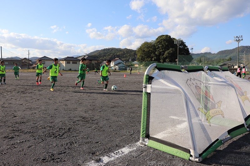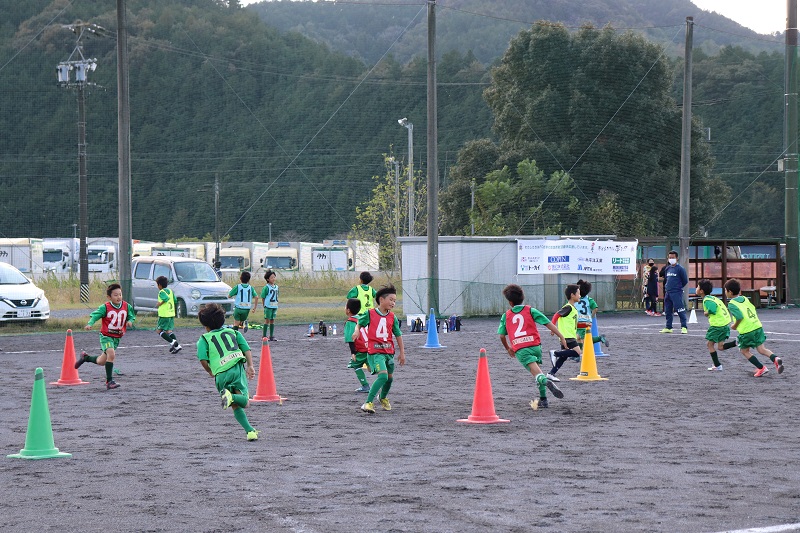 山に囲まれたグラウンドで、澄んだ空気と晴天に恵まれた中、サッカー教室は4つのカテゴリーに分かれて実施しました。