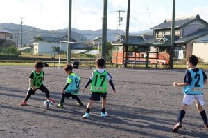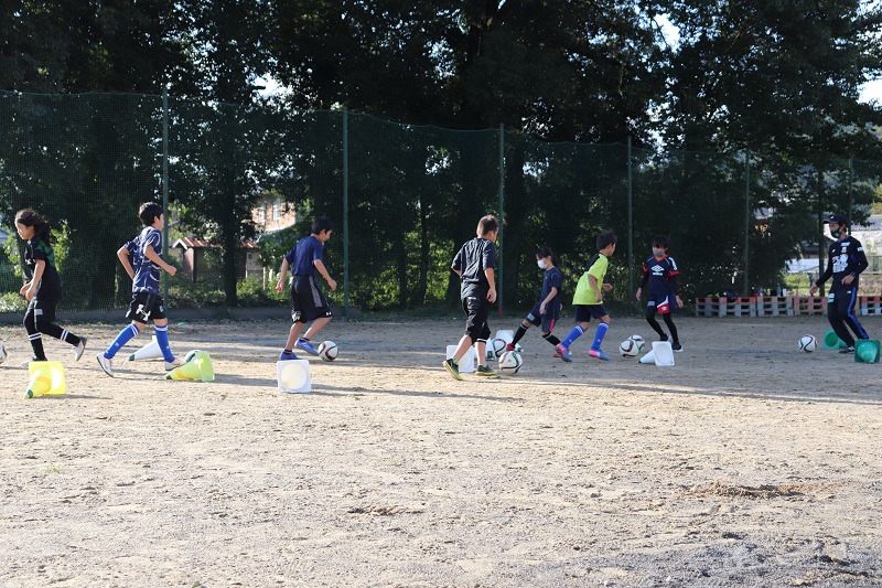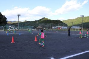 ドリブル、パス、シュートなど基礎トレーニングも、競争したり、遊びを取り入れて楽しく行いました。