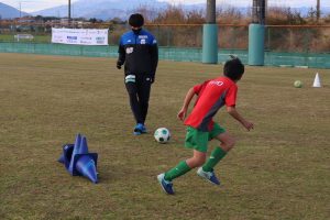 5・6年生ではコーンをかわし、柳澤選手からパスを受けてシュートの練習をしました。