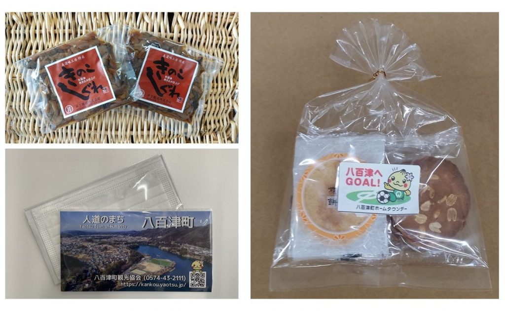八百津町ホームタウンデーとして、「きのこしぐれ(しめじの佃煮)」、「八百津せんべい」、「八百津町観光協会 マスク」など様々な来場者プレゼントをご提供いただけることに御礼を申し上げました。