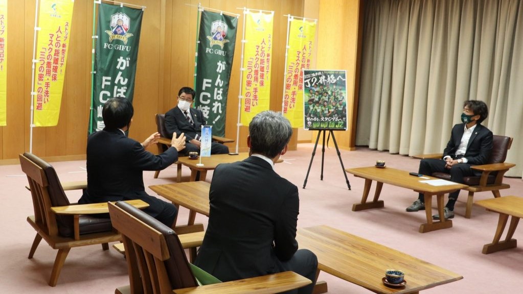 古田肇岐阜県知事からは「FC岐阜は、県内の全市町村すべてが株主でありスポンサーであるなど、全県挙げて応援している唯一のクラブです。県民の願いは一つでも多くの白星を勝ち取ることですので、昇格目指してがんばってください。」と力強い激励のお言葉をいただきました。