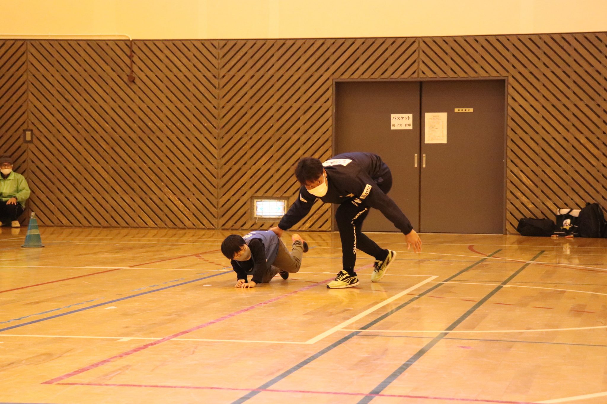 まずは「ウォーミングアップ」を行いました。選手と一緒に鬼ごっこやしっぽとりで楽しく身体を温めました。