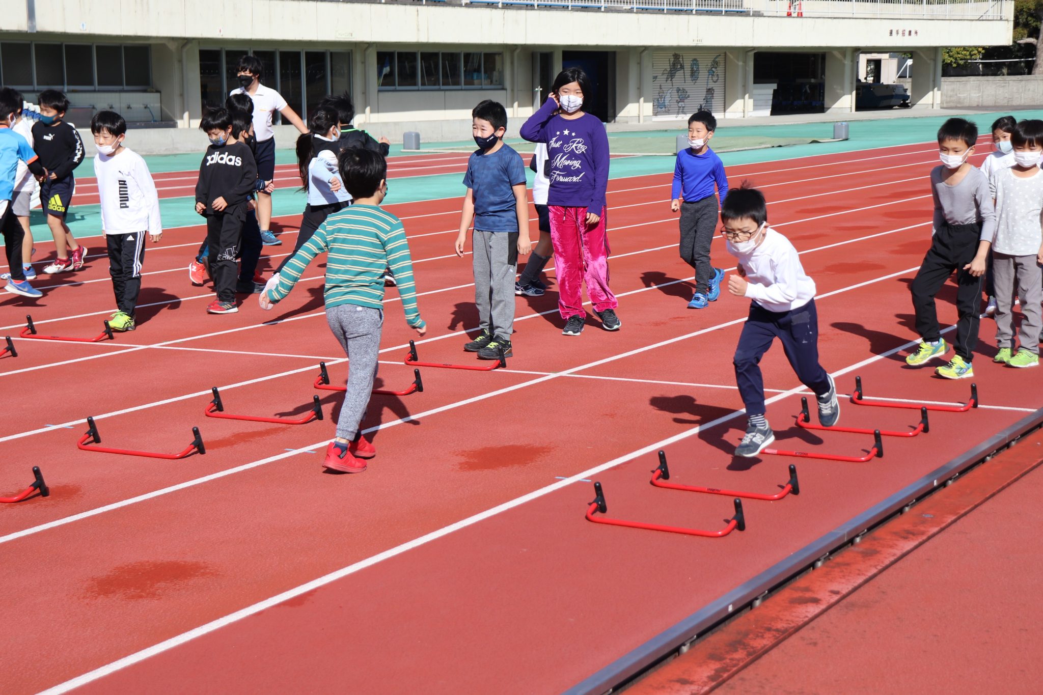 ミニハードルを使って足の設置・運び・設置時間など、ドリル運動で反復練習。