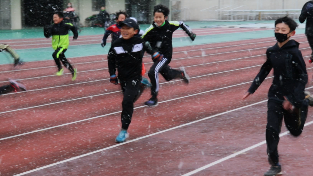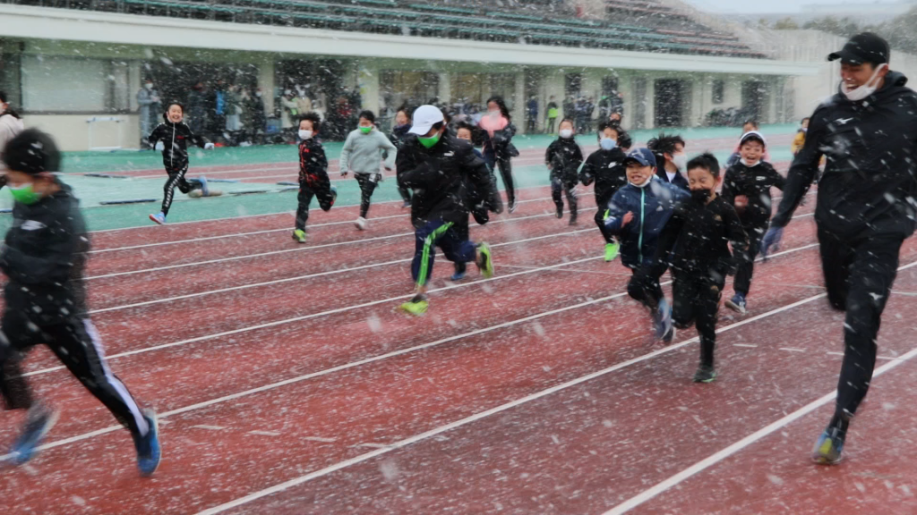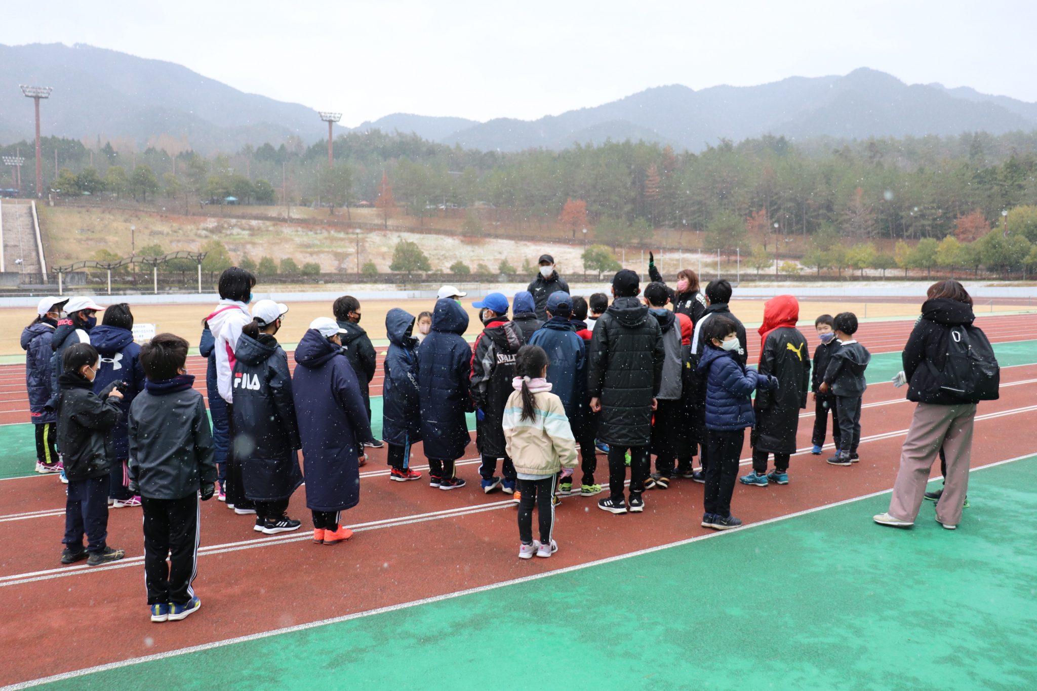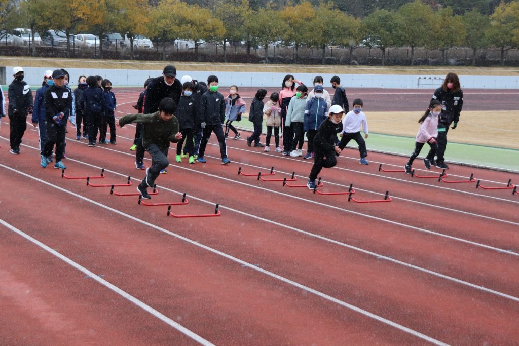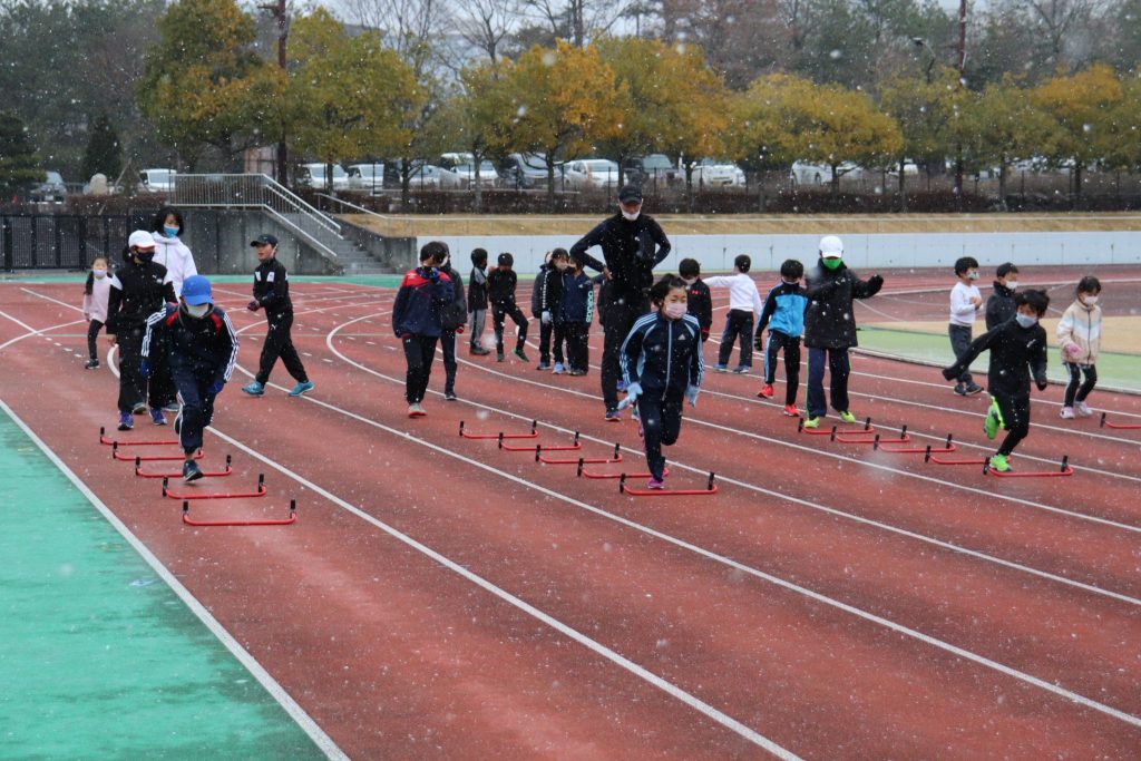 雪が舞う寒い中、さっそくかけっこ教室がスタート!