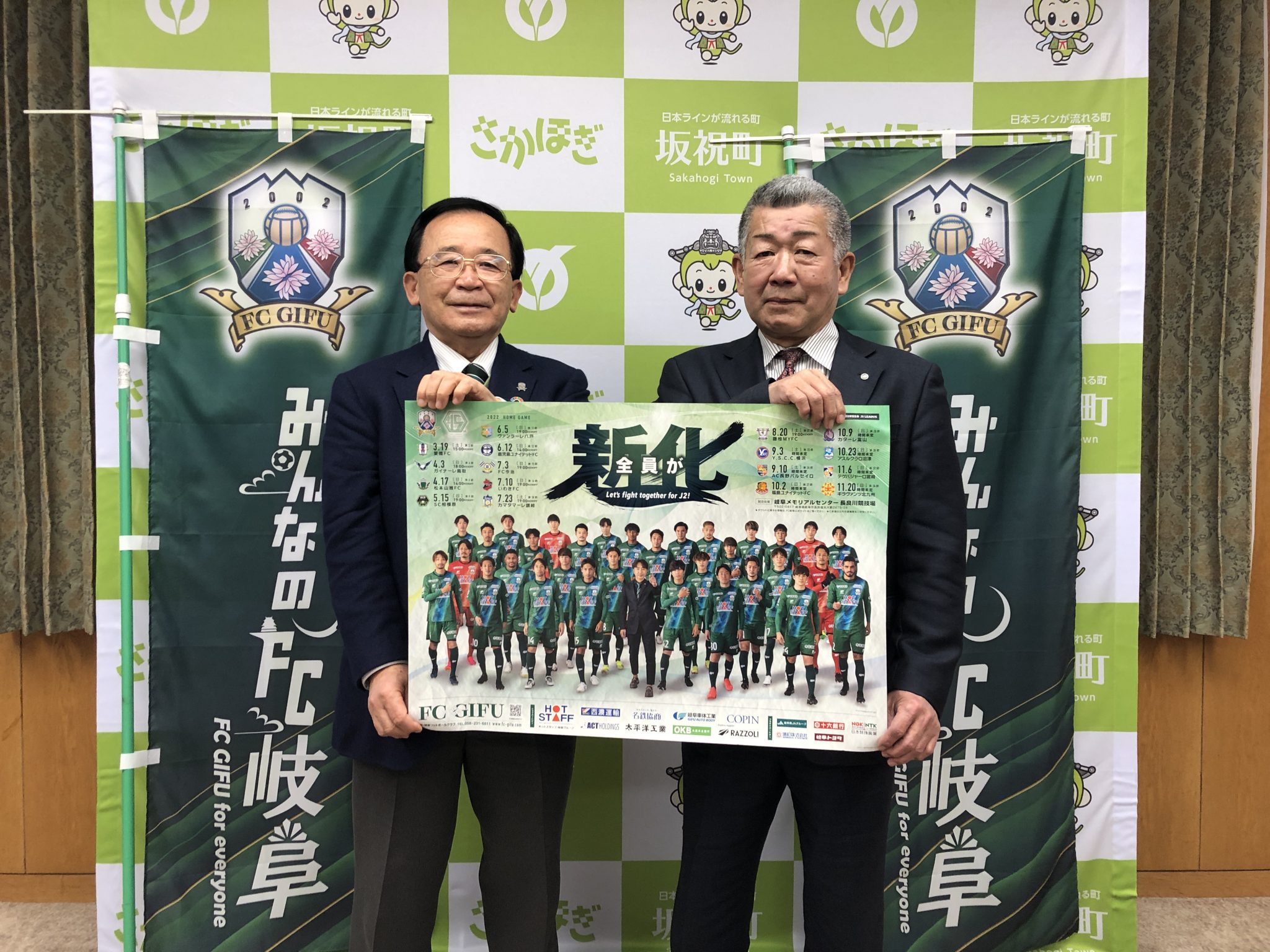 3月19日(土)ホーム開幕戦となる愛媛FC戦の「坂祝町ホームタウンデー」開催にあたり、3月1日(火)坂祝町役場にて、宮田 博之 会長が、柴山 佳也 坂祝町長を表敬訪問させて頂きました。