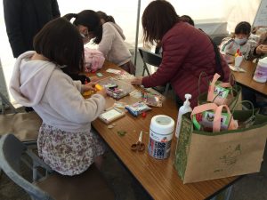 「クラフト体験ブース(板蔵ファクトリー株式会社)」では、思い思いに木や小物を貼り付けて作品を仕上げていました。