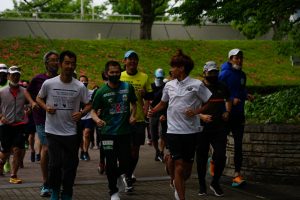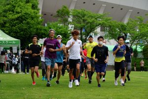 最後に参加者の皆さんと芝生広場内で10分間走を行いました。神野選手もペースを上げながら、参加者と一緒に快走していました。参加者の皆さんもプロランナーの神野選手と一緒に走ることができる貴重な機会となりました。