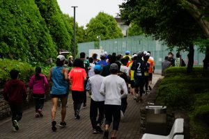 最初に全員で野球場の外周を軽くランニングして、ウォーミングアップを始めていきました。神野選手も参加者の皆さんに声を掛けていました。