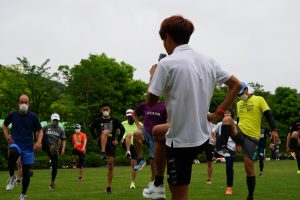 神野大地選手から自分がレース前に行っているウォーミングアップについて説明があり、全員で体を動かしていきます。神野選手から、肩の周りや肩甲骨の周りを大きく動かすことにより、ランニング中の腕ふりをスムーズにしていくという説明がありました。