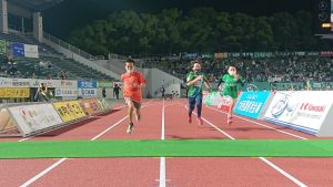 そして特別企画として、今回、神野選手から「子どもたちに大勢の観客の前で走ってもらいたい」ということで、9名の子どもたちを選出し、ハーフタイムに50mタイム測定会を実施し、貴重な体験となりました。