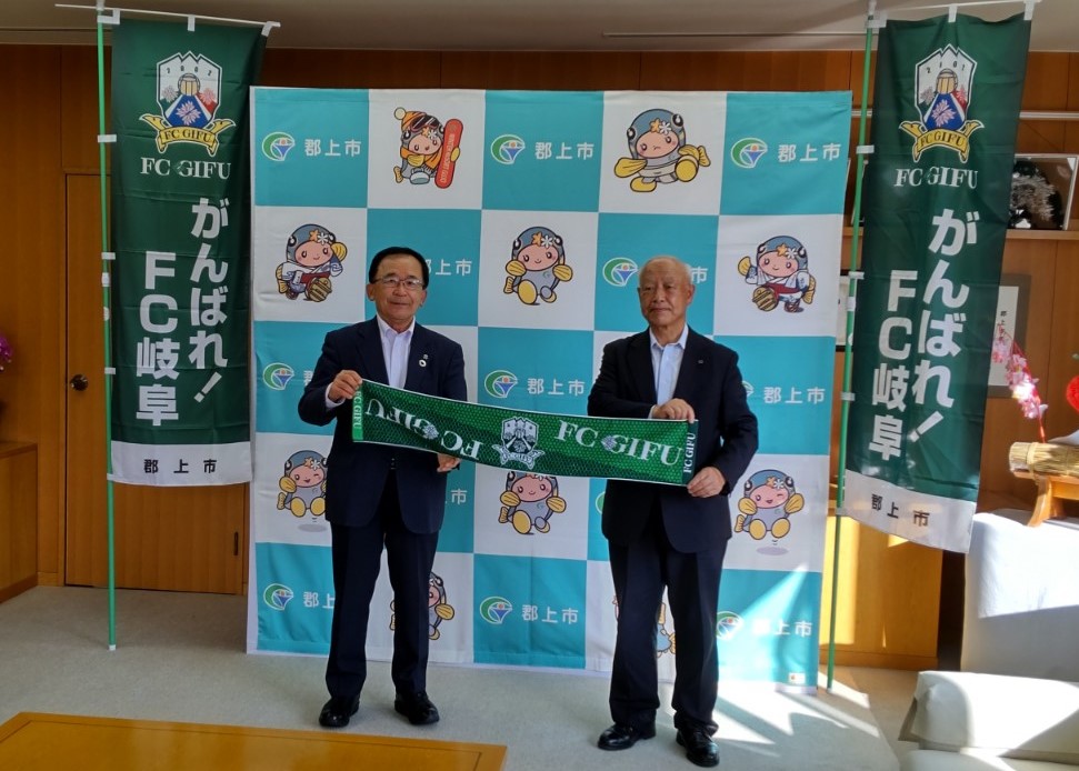 7月3日(日)のJ3リーグ第15節、ホームでのFC今治戦の「郡上市ホームタウンデー」開催にあたり、6月2日(木)郡上市役所にて、宮田 博之 会長が、日置 敏明 郡上市長を表敬訪問させていただきました。