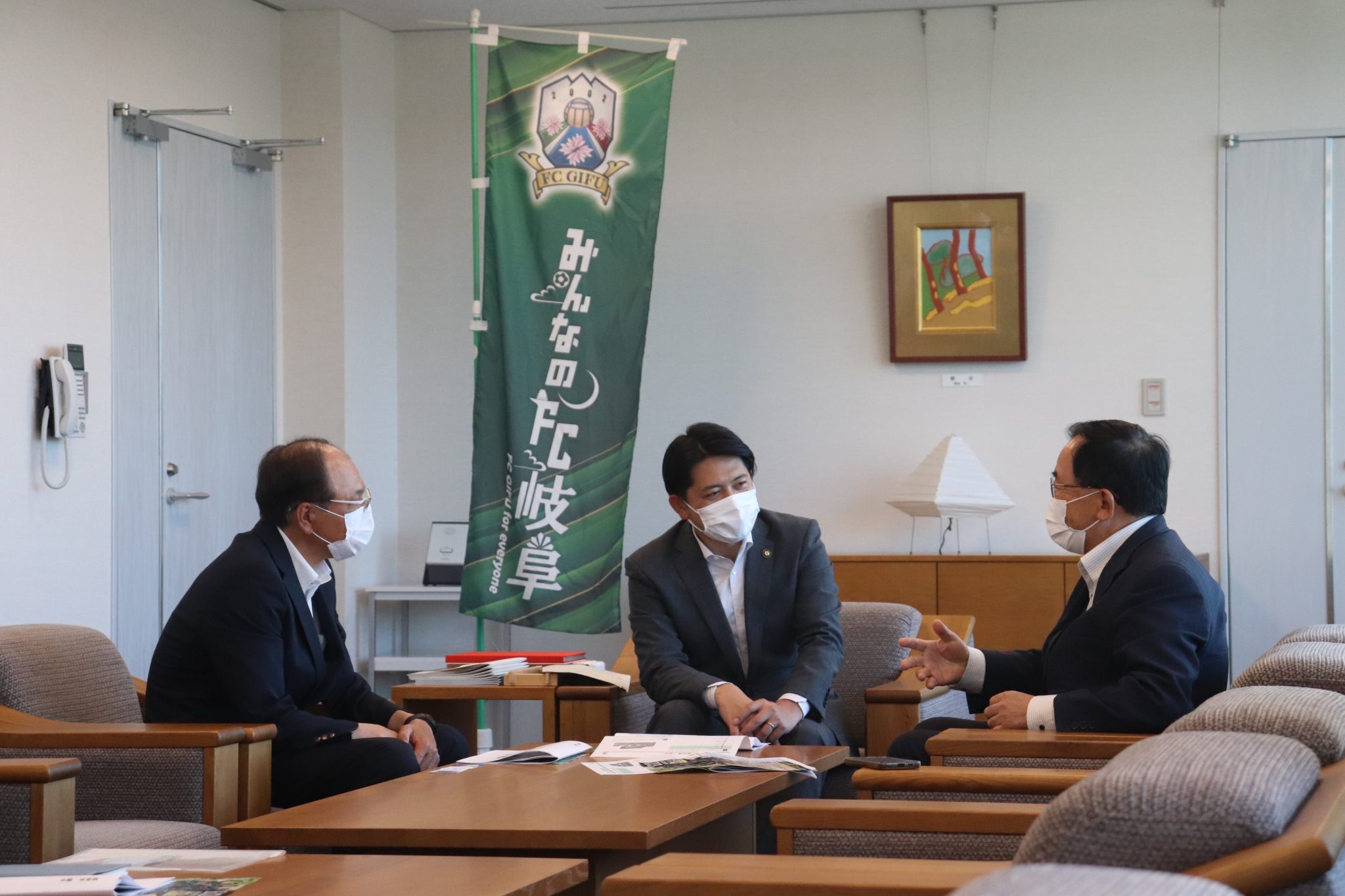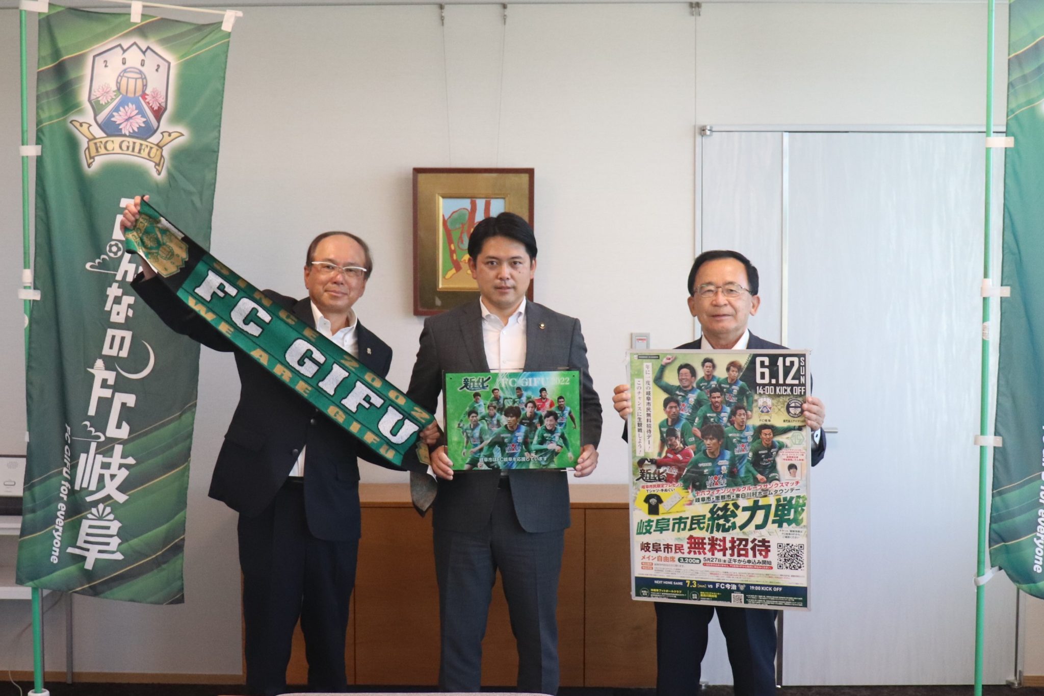 6月12日(日)鹿児島ユナイテッドFC戦(14時キックオフ) の「岐阜市ホームタウンデー」開催にあたり、6月7日(火)岐阜市役所にて、宮田 博之 会長、山道 守彦 チーム統括本部長が、柴橋 正直 岐阜市長を表敬訪問させていただきました。
