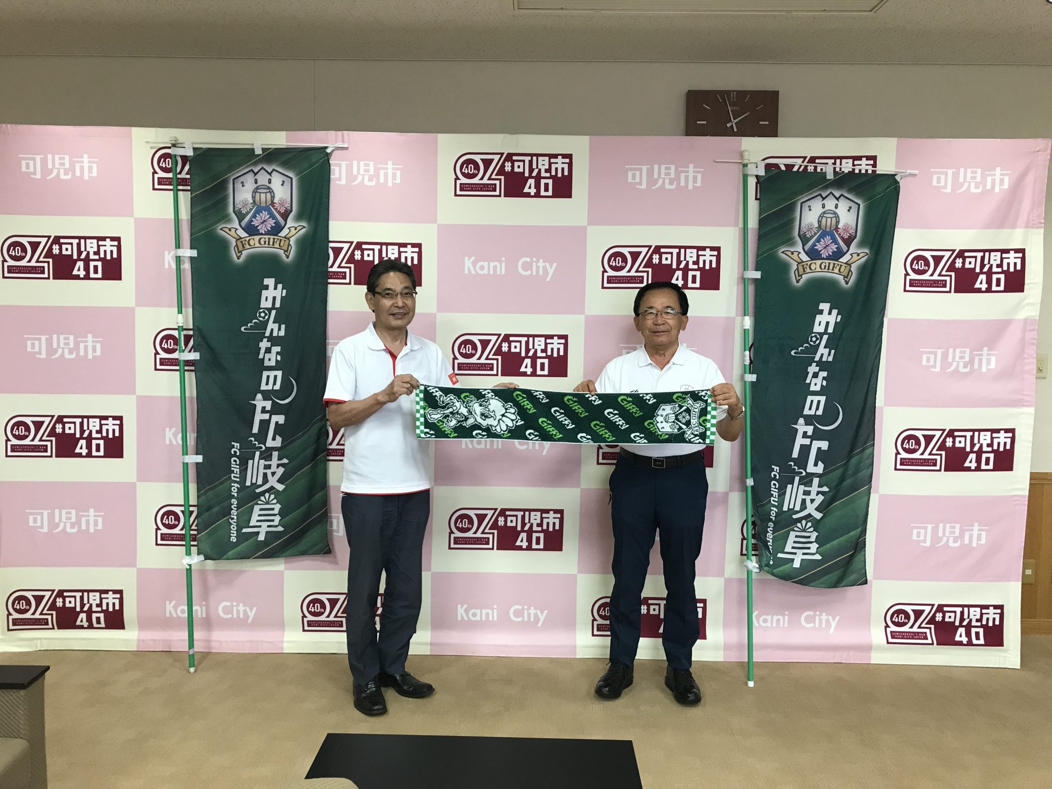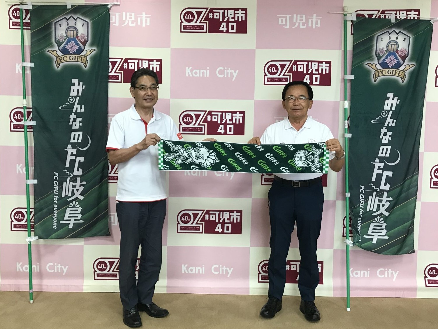 10月9日(日)のJ3リーグ第28節、ホームでのカターレ富山戦の「可児市ホームタウンデー」開催にあたり、8月22日(月)可児市役所にて、宮田 博之 会長が、冨田 成輝 可児市長を訪問させていただきお礼やお願いを申し上げました。