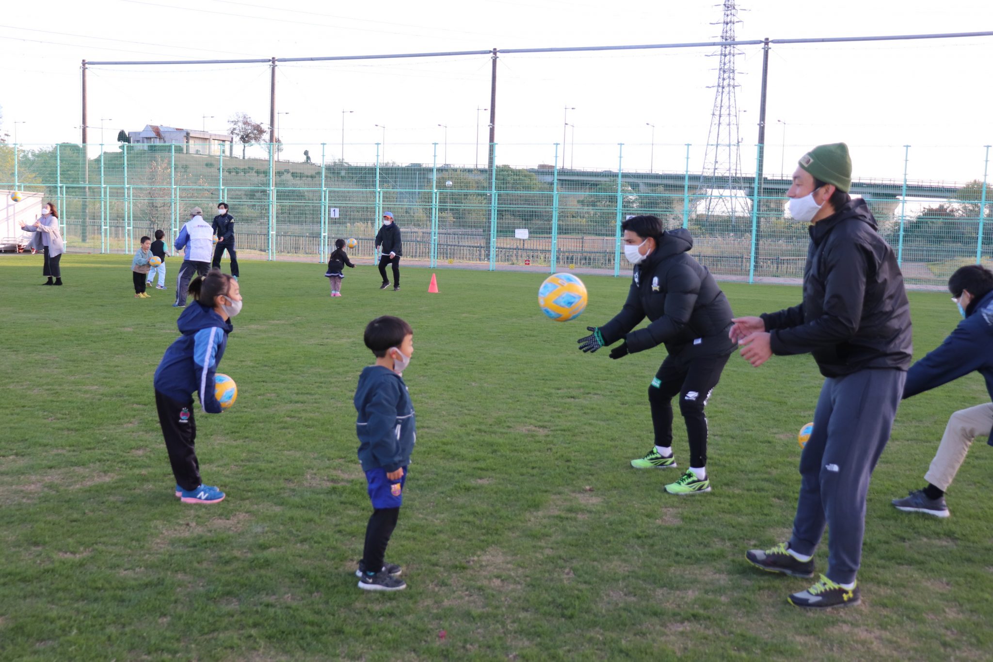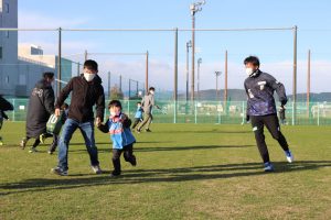 「初めてサッカーをするよ」というたくさんの子どもたちが多く参加してくれました。親子でペアとなり鬼ごっこやボールフィーリング、ドリブルなどのトレーニングを楽しく行いました。選手も一緒に参加し、トレーニングを盛り上げてくれました。