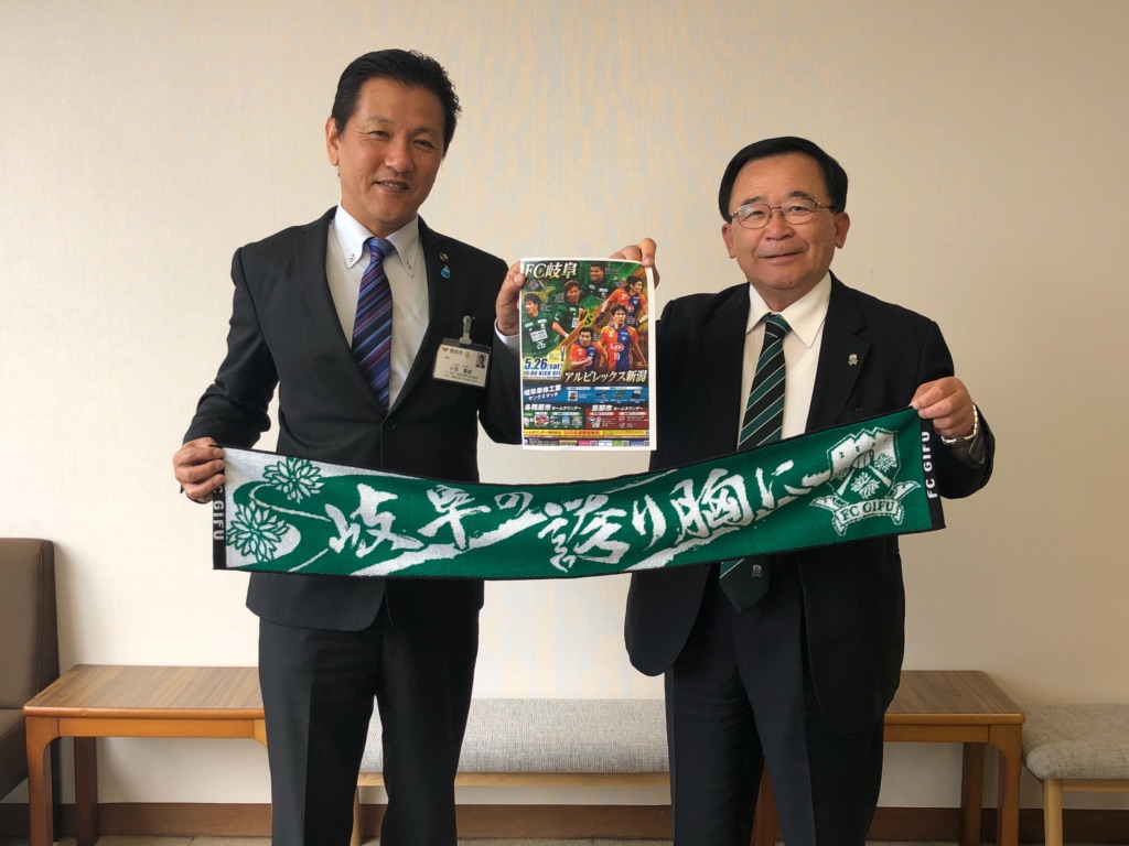 5月26日(土)アルビレックス新潟戦(15時キックオフ) の「恵那市ホームタウンデー」開催にあたり、4月17日(火)恵那市役所にて、小坂喬峰 恵那市長を宮田社長が表敬訪問させて頂きました。
