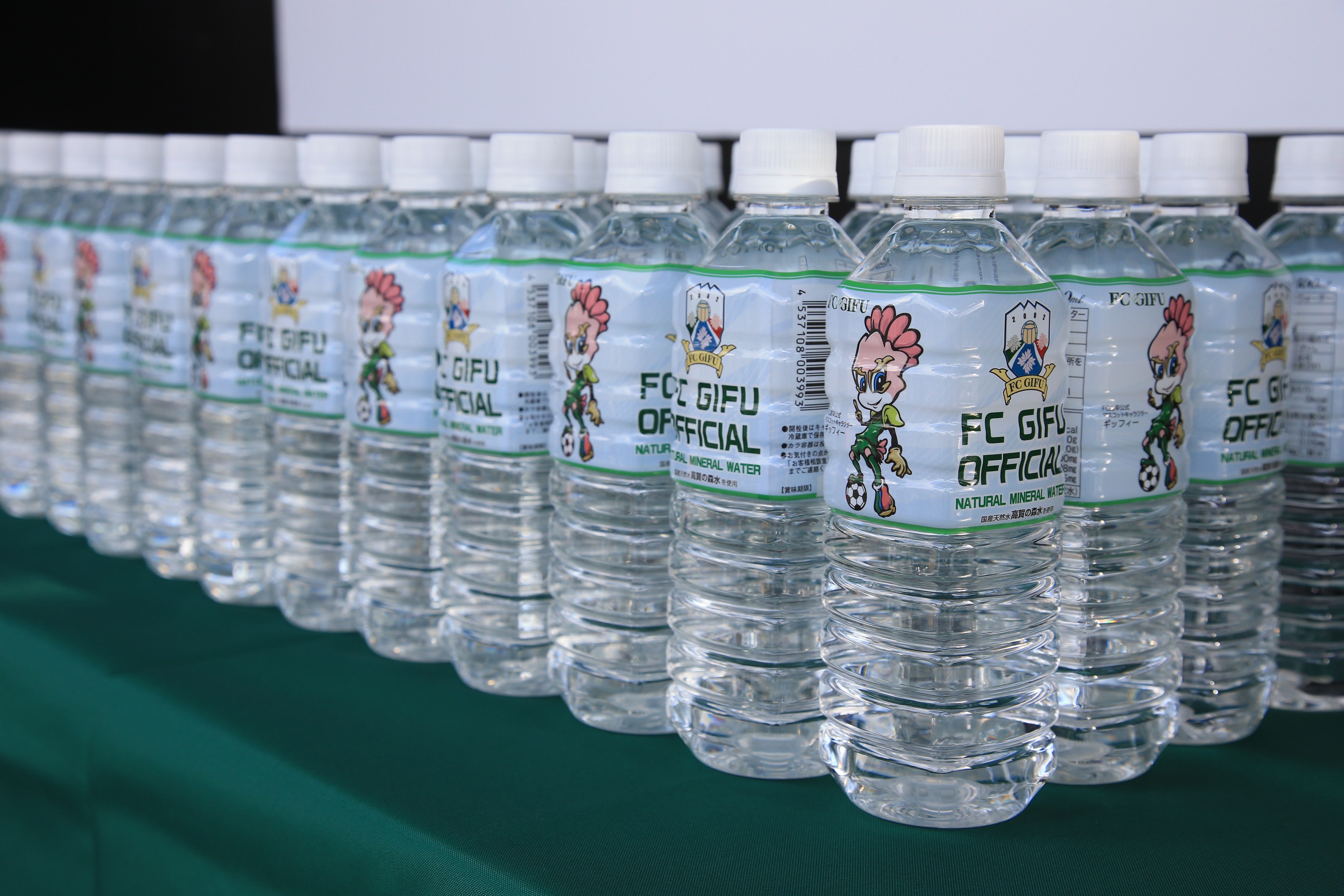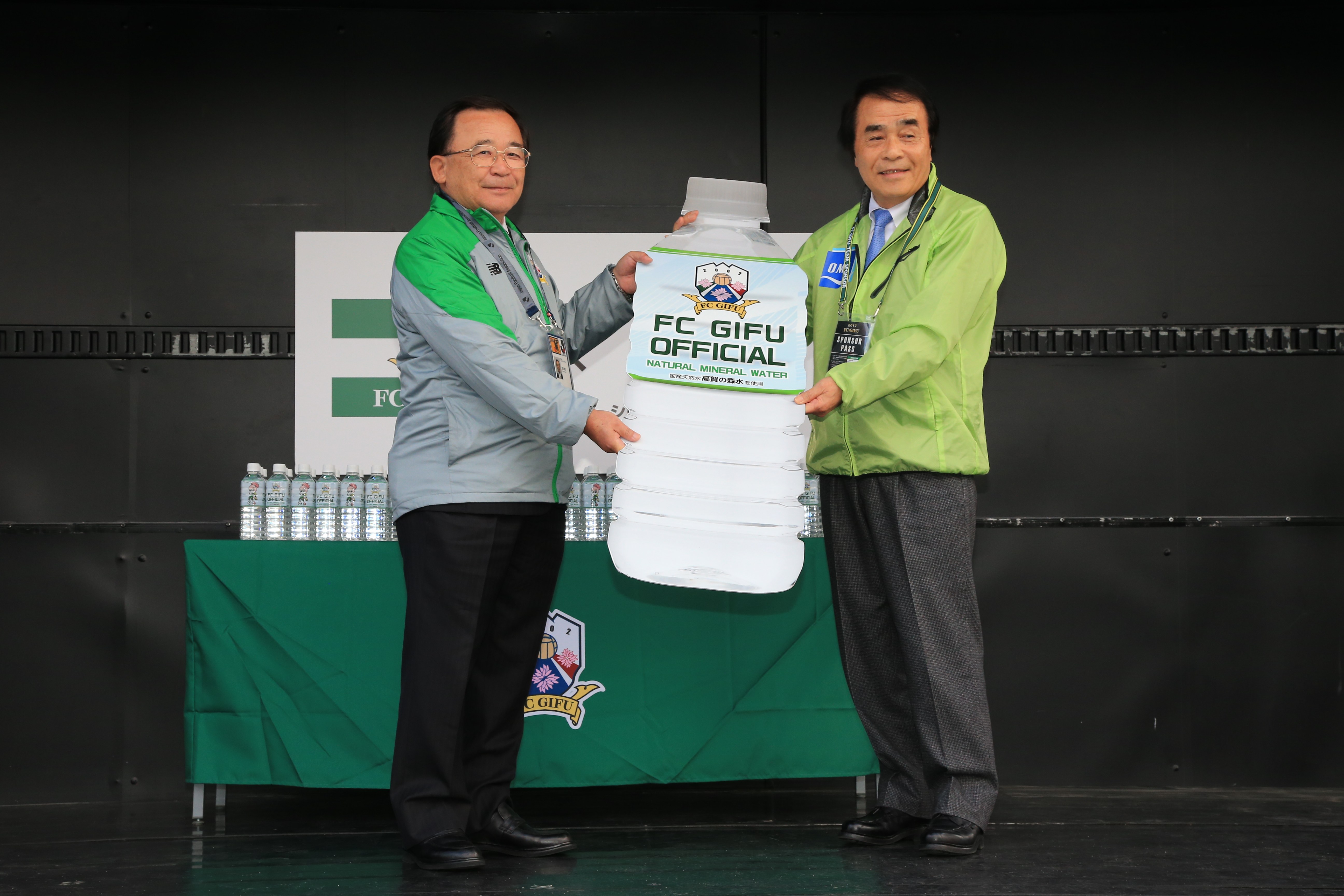 奥長良川名水株式会社の中村社長に登壇いただきまして、新パッケージとなったFC岐阜オフィシャルウォーターの贈呈式を行いました。その後、先着100名様に非売品のオフィシャルウォーターをプレゼント。予定数以上の方にご参加いただきましてありがとうございました!