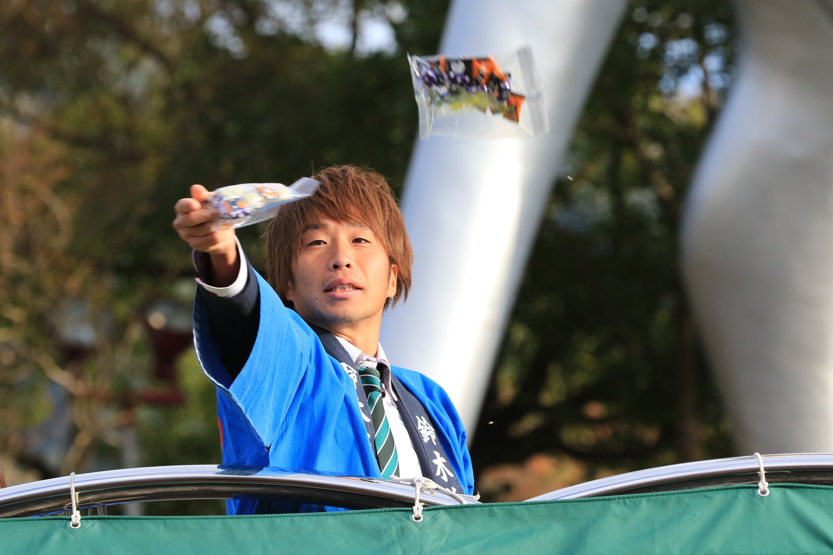 雨のため延期となっていたお菓子まきを開催いたしました。撒き手として、FC岐阜からは阿部正紀選手、山田晃平選手、甲斐健太郎選手、クリスチャン選手が参加。伊藤寧々さんや、プリニー、スタジアムDJの平松さんもお菓子まきに参加していただきました。本当に多くの方に楽しんで頂いて、ものすごい熱気と盛り上がりでした♪