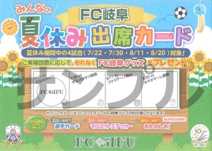 7/22 FC町田ゼルビア戦でみんなの夏休み出席カードをもらった人を対象に、7/22~8/20のホームゲーム4試合の来場回数によってFC岐阜オリジナルグッズをもれなくプレゼントしております。