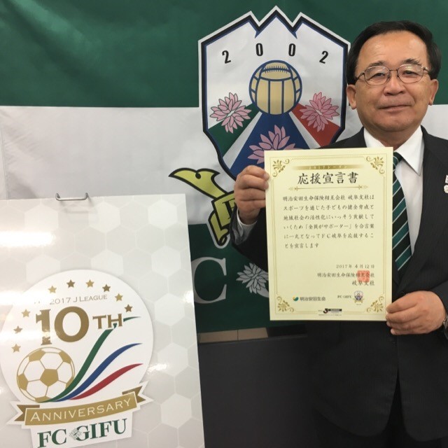 4月12日、岐阜市文化センターにて、FC岐阜のオフィシャルスポンサーである明治安田生命保険相互会社 岐阜支社様より『応援宣言書』をいただきました。