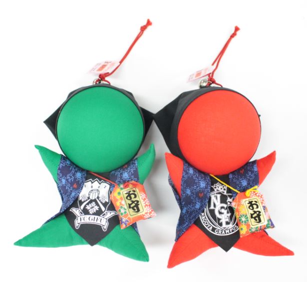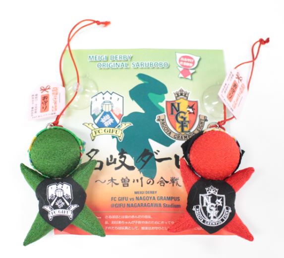 FC岐阜と名古屋グランパスそれぞれのクラブカラーをまとい、チームエンブレムを胸に印したオリジナルデザインの岐阜県飛騨地方の郷土工芸品「さるぼぼ」を2個セットで発売いたします。