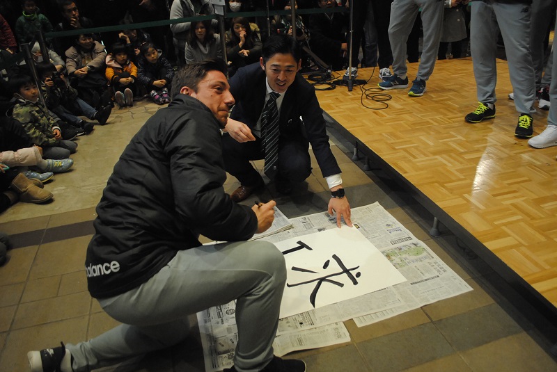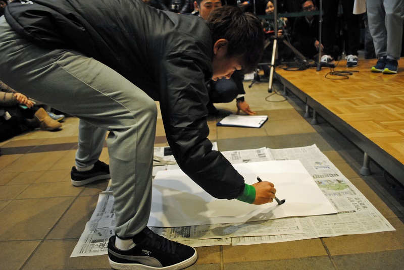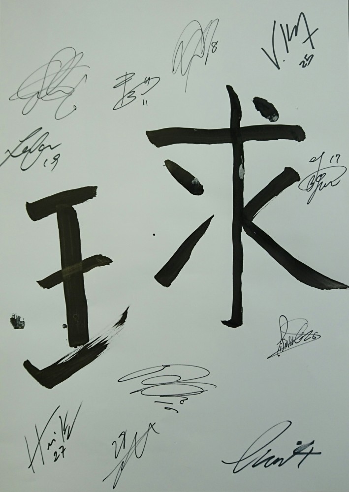お題は、11画の漢字「球」。リレー書初めは、永島選手⇒ヘニキ選手⇒ビクトル選手⇒薮内選手⇒大本選手⇒福村選手⇒古橋選手⇒庄司選手⇒シシーニョ選手⇒野澤選手⇒甲斐選手の順番で筆を入れてきました。