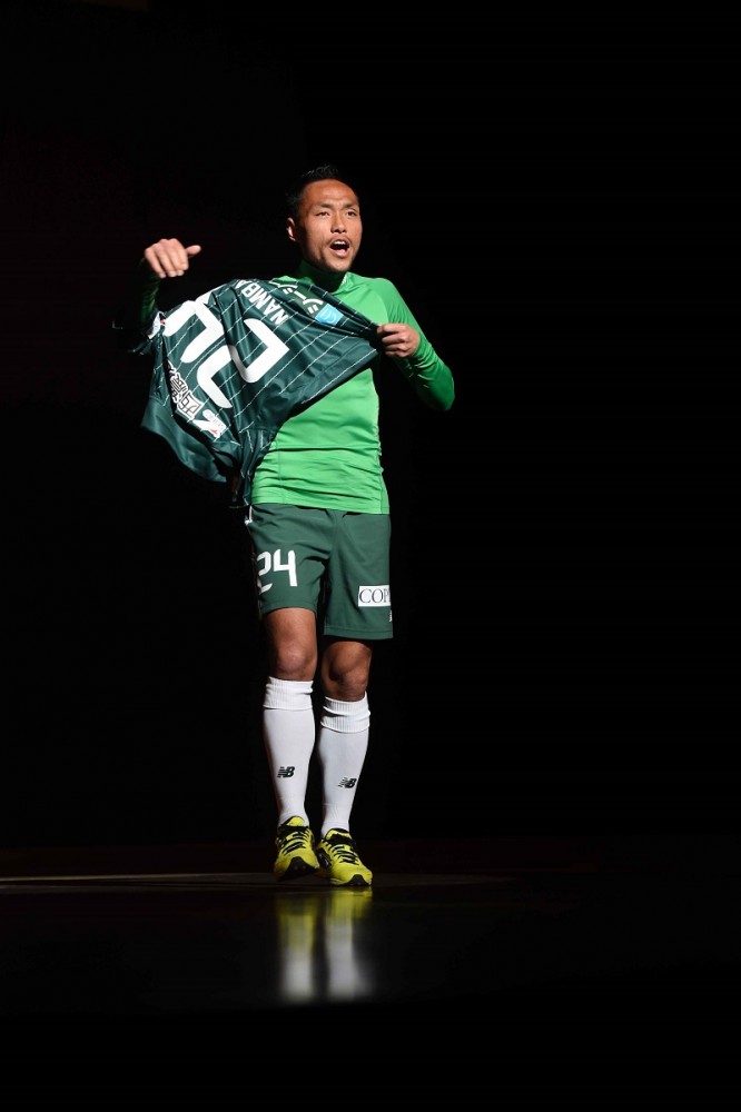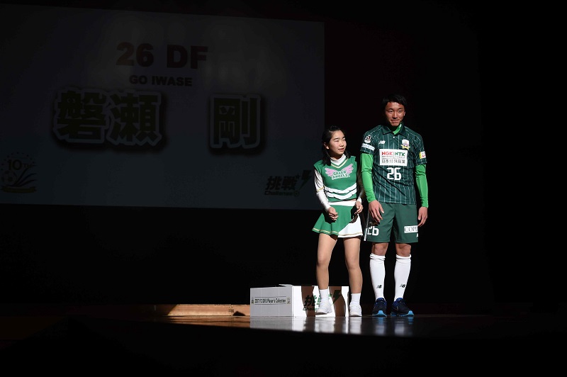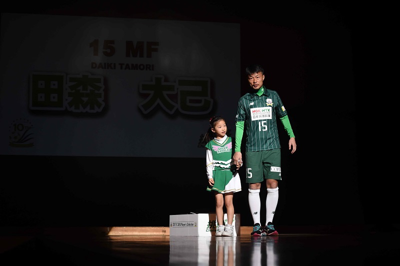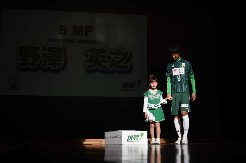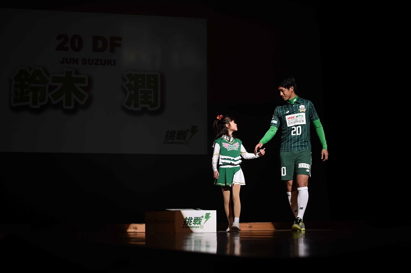 そして、いよいよ新ユニフォームを身にまとった選手たちが登場しました。グリーンエンジェルズの子どもたちにエスコートされて、各選手はステージへ上がり自己紹介をしていきます。