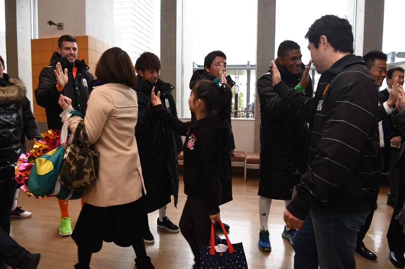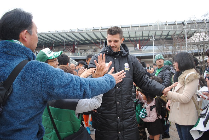 2017FC GIFU Player`s Collection!! のお客様をハイタッチでお見送りした大木監督、全選手たちは、「信長ゆめ広場」へ移動し、多くのファン・サポーターの皆様の前でユニフォーム姿を披露し、写真撮影を行いました。