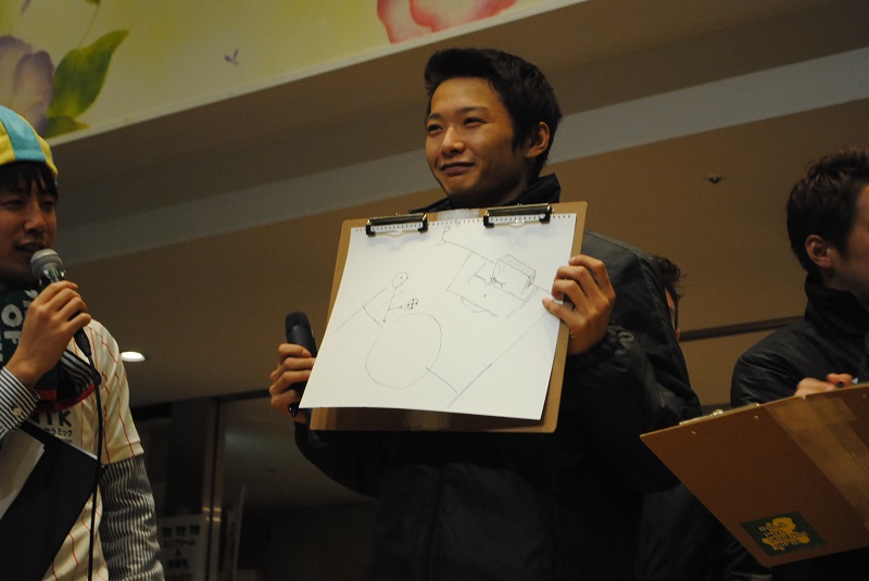 絵心対決中に行われたけん玉対決には、シシーニョ選手、庄司選手、大本選手、薮内選手、ビクトル選手、永島選手の6選手が参加し、その中で本人も驚く、1回で成功させた永島悠史選手が優勝しました。