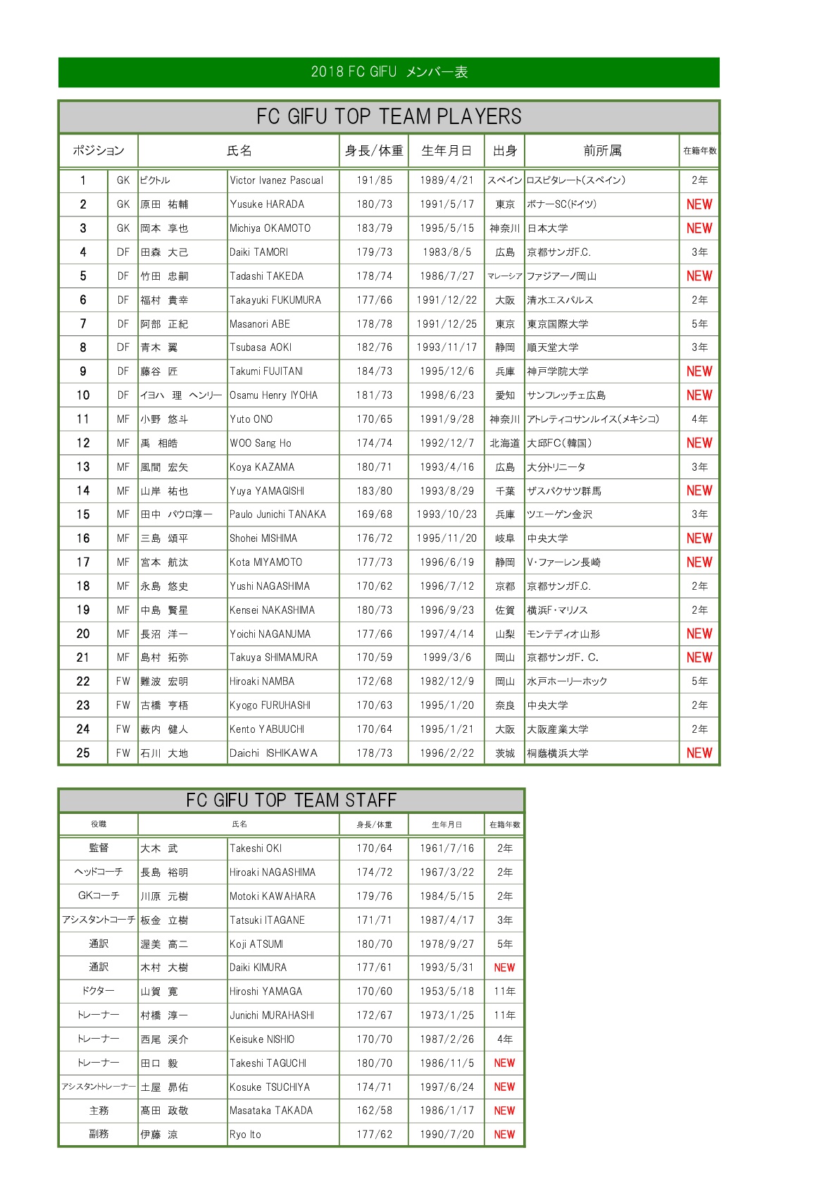 2018.01.11 (Thu) お知らせ 2018シーズン新体制決定のお知らせ 2018シーズンの新体制が決定しましたので、お知らせいたします。なお、選手背番号につきましては、1月21日(日)開催のFC岐阜まつり「2018 FC GIFU Player’s Collection」内のイベントにて発表させていただきます。
