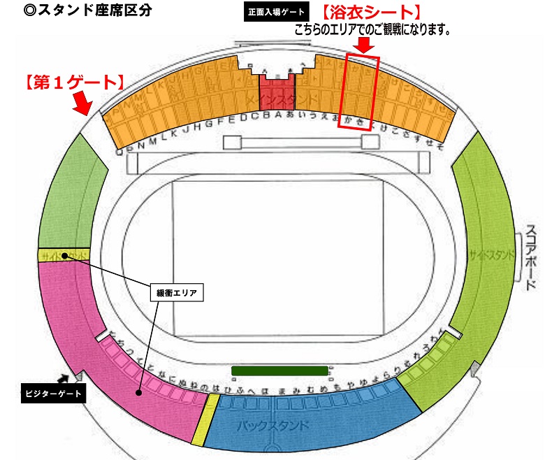 浴衣及び甚平でご来場頂いた方は、どの席種のチケットでもメインスタンド(か~きブロック)の浴衣シートでご観戦いただけます!