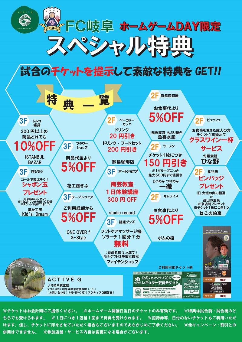 【更新】FC岐阜チケットで試合の前後も楽しもう!アクティブG×FC岐阜「ホームゲームDAY限定スペシャル特典」実施のお知らせ