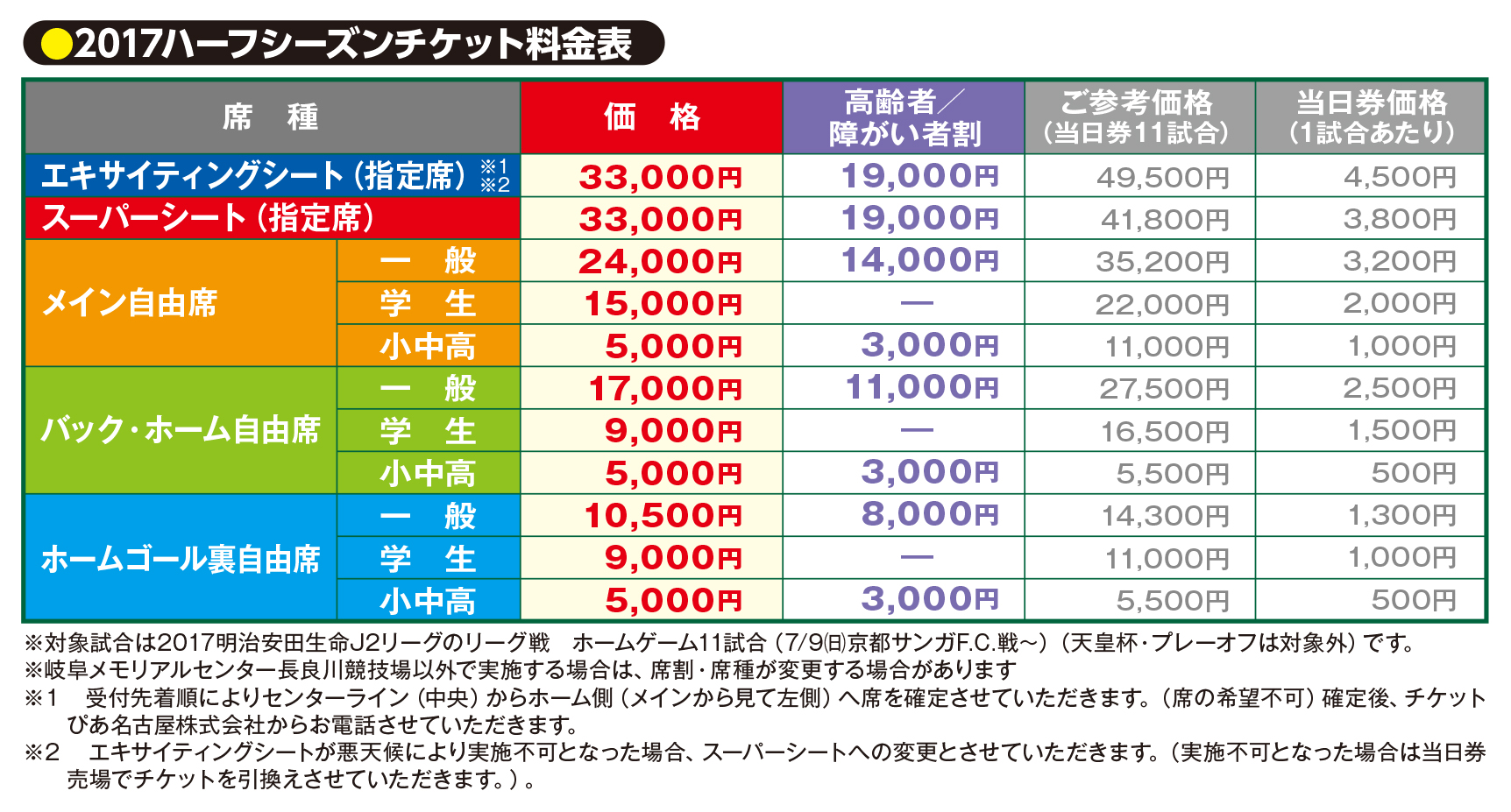 この度、7月9日(日)京都サンガF.C.戦以降のホームゲーム全11試合の観戦が可能なFC岐阜ハーフシーズンチケット2017の販売が決定しましたのでお知らせします。