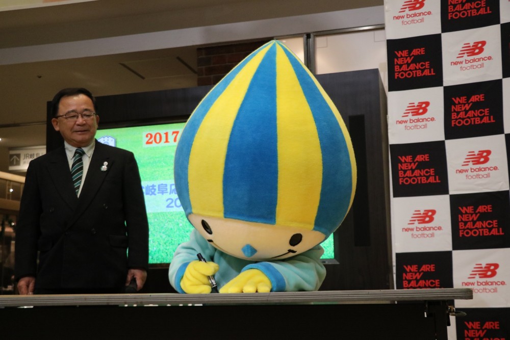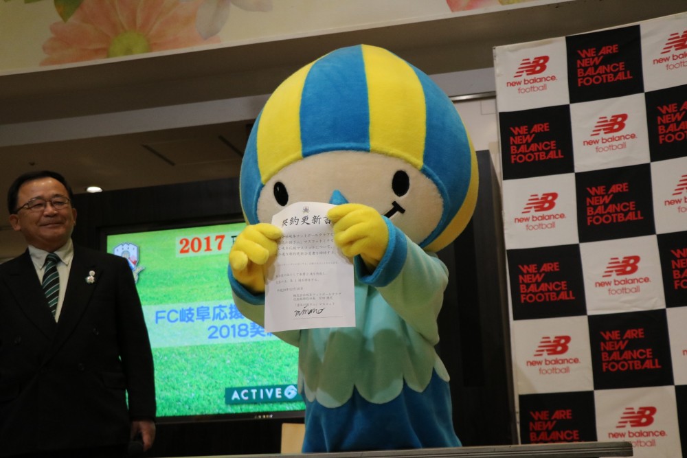 FC岐阜では、岐阜県より期限付き移籍をしている清流の国ぎふマスコットキャラクター「ミナモ」と、応援マスコットの契約を更新いたしましたので、お知らせ致します。12月10日に行われたアクティブGでのクリスマスフェスタでは、契約更新書にサインをし、皆さんの前で契約更改をご報告いたしました。2018シーズンもどうぞよろしくお願い致します。