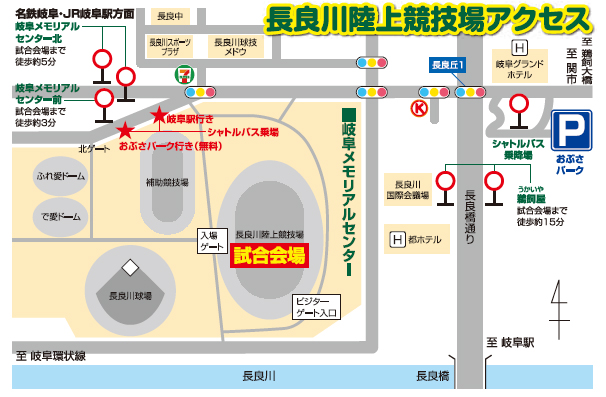 お車で来るナガラジェンヌには、おぶさパーク(岐阜グランドホテル前河川敷)の臨時駐車場なら駐車料金無料、シャトルバス無料なので、お得にスタジアムまで来れちゃいます。