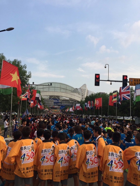 岐阜市信長公450プロジェクト様から提供していただいた法被を来て、世界に岐阜をアピールしながら多くの選手、関係者と写真を撮ったり身振り手振りでコミュニケーションをとりました。世界大会という事もあり、凄い規模のオープニングセレモニーになりました。