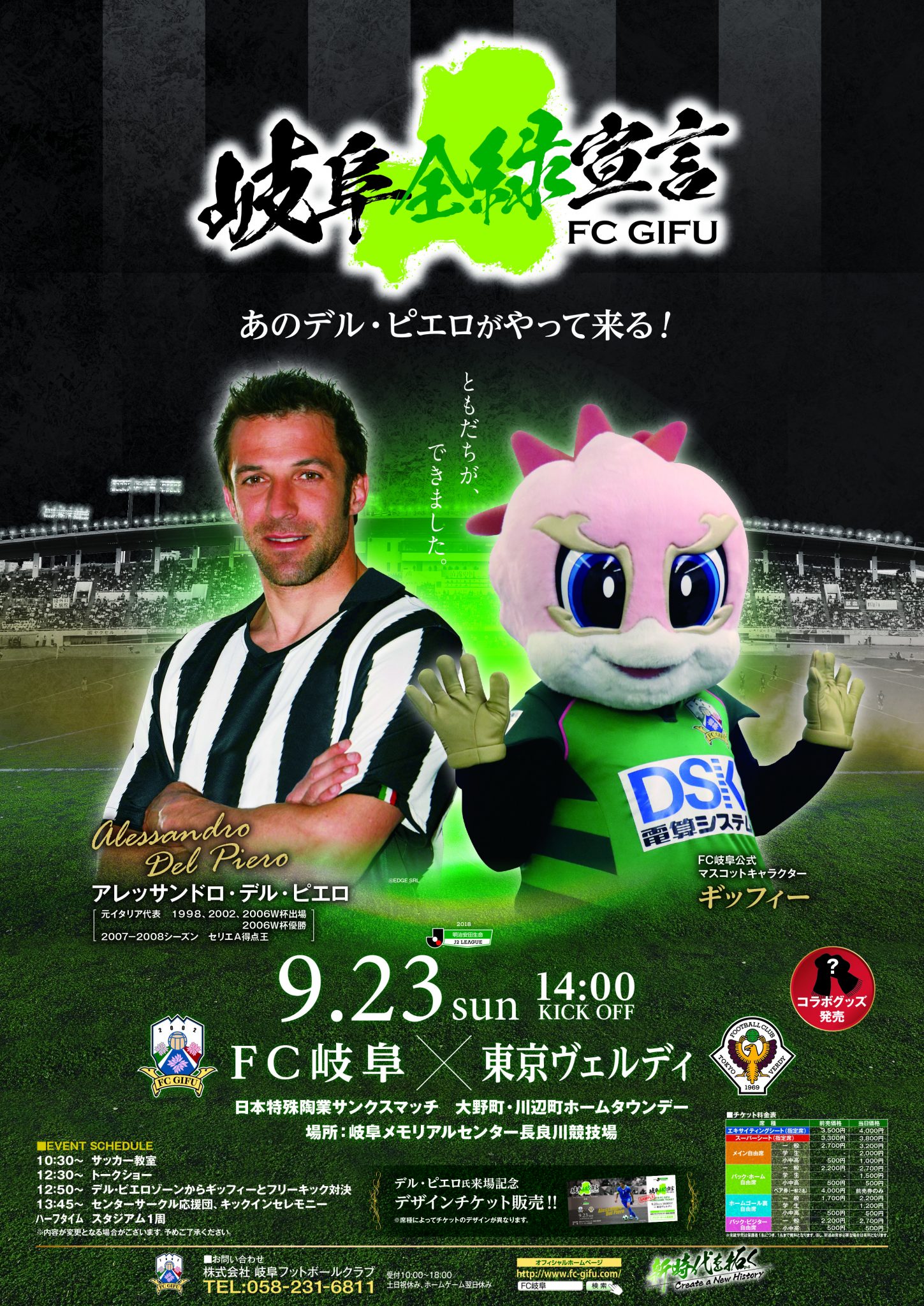 「岐阜全緑宣言」第1弾として、サッカー元イタリア代表 アレッサンドロ・デル・ピエロ氏が来場する東京ヴェルディ戦に多くの方にスタジアムへご来場いただきたく、ぜひ、ファン・サポーターの皆様にはポスター掲示のご協力をお願い申し上げます。