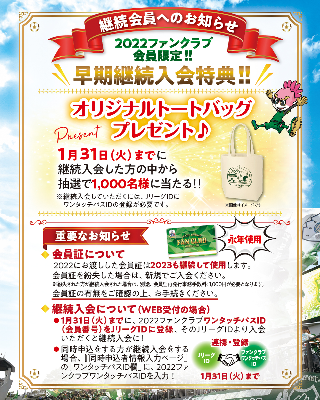 2022ファンクラブ会員様限定!!1月31日(火)までに継続入会いただくと、抽選で1,000名様にオリジナルトートバッグが当たりますので、ぜひ2023シーズンもファンクラブにご入会いただき、FC岐阜へ熱いご声援をお願いいたします。