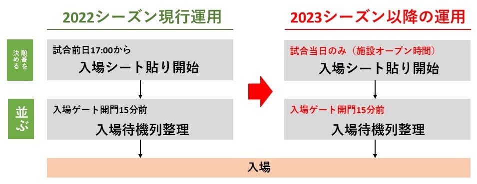 2022シーズンよりFC岐阜ホームゲームにおける入場待機シート貼りは、施設オープン直後の入場トラブルや交通トラブルの状況を鑑み、試合前日17時から可能としておりました。しかしながら多くの方が試合前日にお並びいただく状況にあり、シート管理の難しさや熱中症などの体調面の問題で多くのご意見をいただきました。