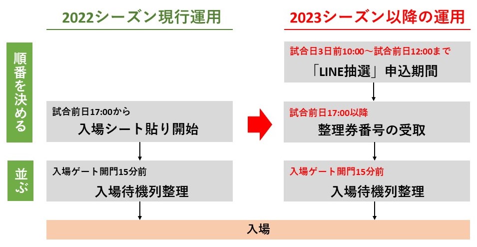 今後の状況により、シーズン途中であっても運用方法を変更する場合がございます。 観戦にあたっては、観戦ルールを厳守のうえ、熱い応援をよろしくお願いいたします。先行入場一般入場LINEをお持ちでない方