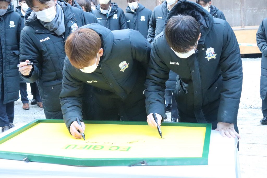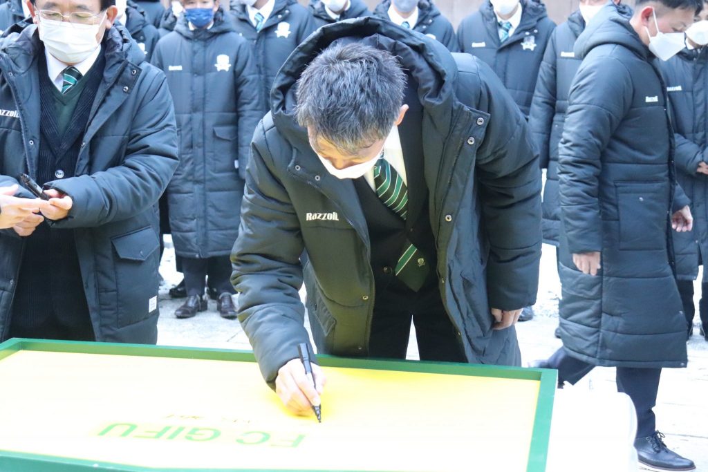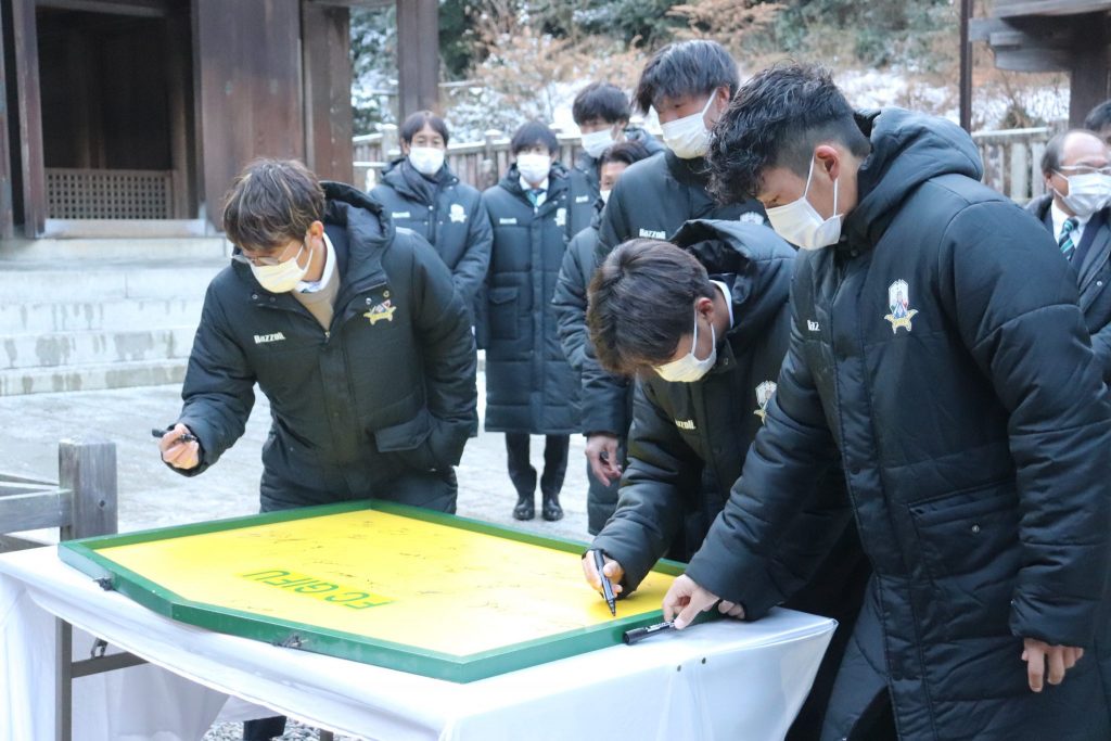 厳粛な神事に続き、今年も大きな絵馬に2023シーズンのJ2昇格を願い、サインを書き込みました。