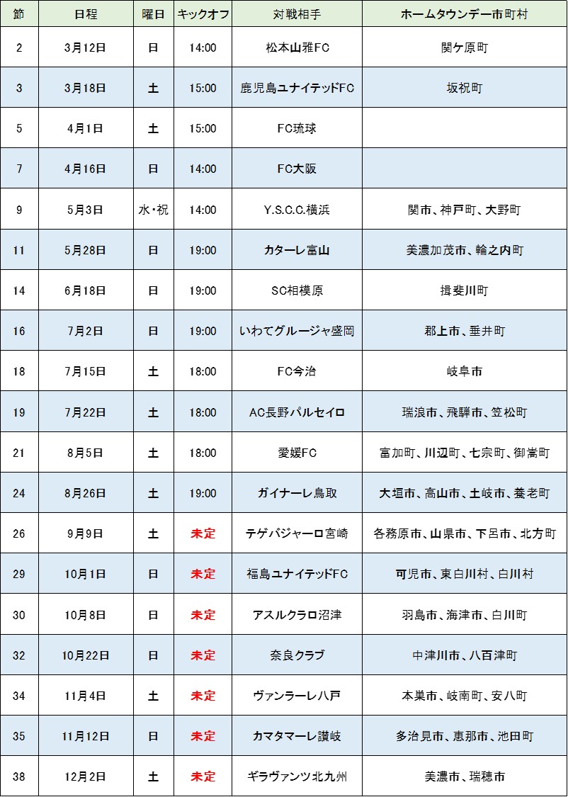 2023シーズンのFC岐阜のホームゲームを岐阜県内全42市町村(ホームタウン)のご協力により一緒に盛り上げていただく、ホームタウンデーの開催日が決定しましたのでお知らせします。