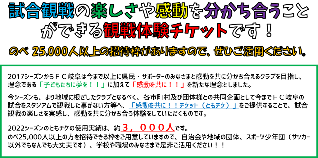 ホームタウンデーでは感動を共にチケットにより開催市町村の住民の方各500名、商工会議所・商工会会員の方各200名無料招待いたします。ぜひこの機会に2023シーズンのFC岐阜を観戦いただき、スタジアムで感動を分かち合いましょう!!多くの皆様の応援を何卒よろしくお願い申し上げます。