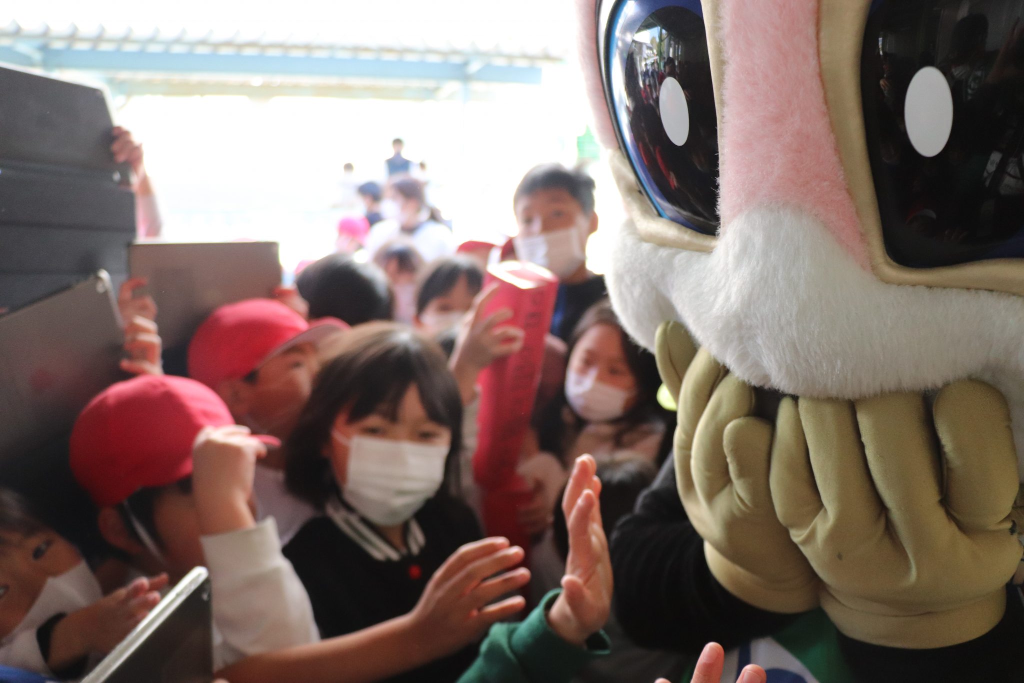 お昼休みには、子どもたちとギッフィーがハイタッチをしたり握手をして触れ合いました。