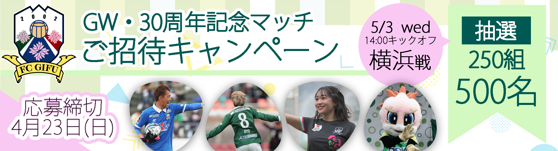 FC岐阜では、5月3日(水・祝) Y.S.C.C.横浜戦、バック・ホーム自由席に250組500名様を無料招待!