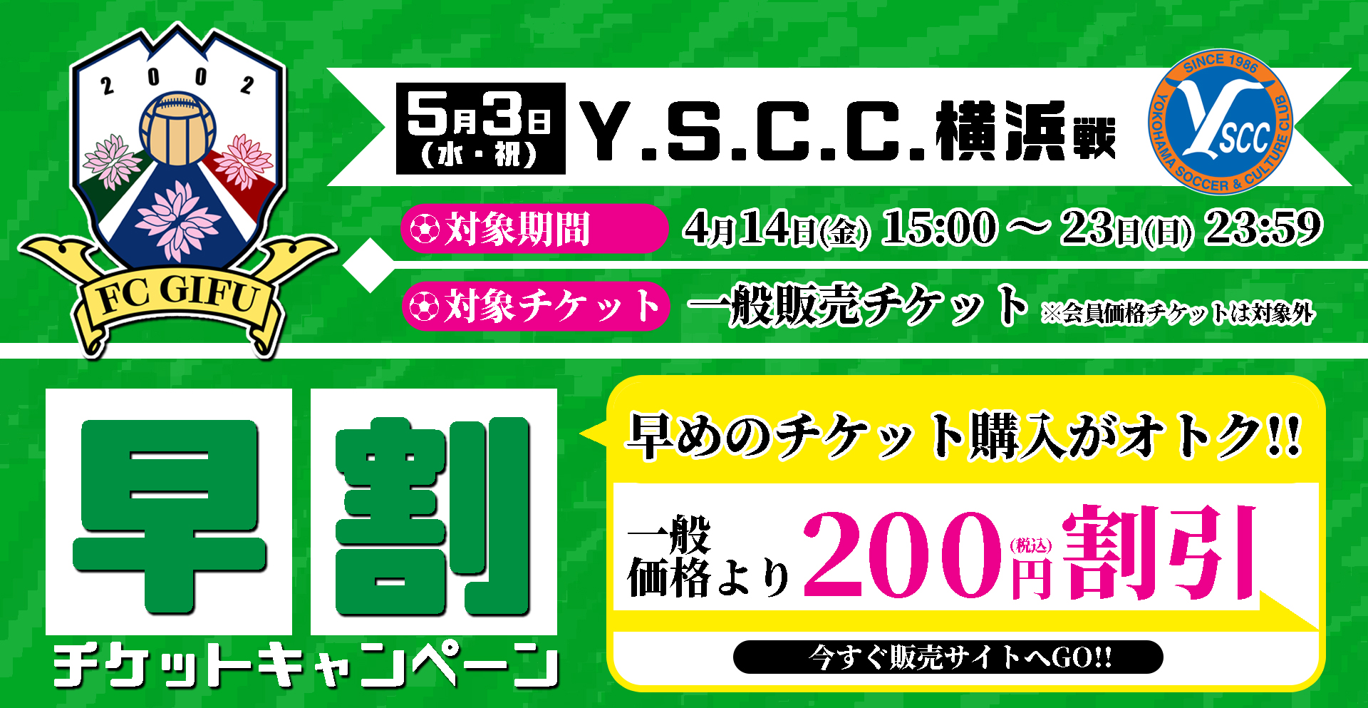【5月3日(水・祝) FC岐阜 対 Y.S.C.C.横浜】の「一般販売チケット」を4月23日(日)にご購入いただいた皆様へのご案内です。