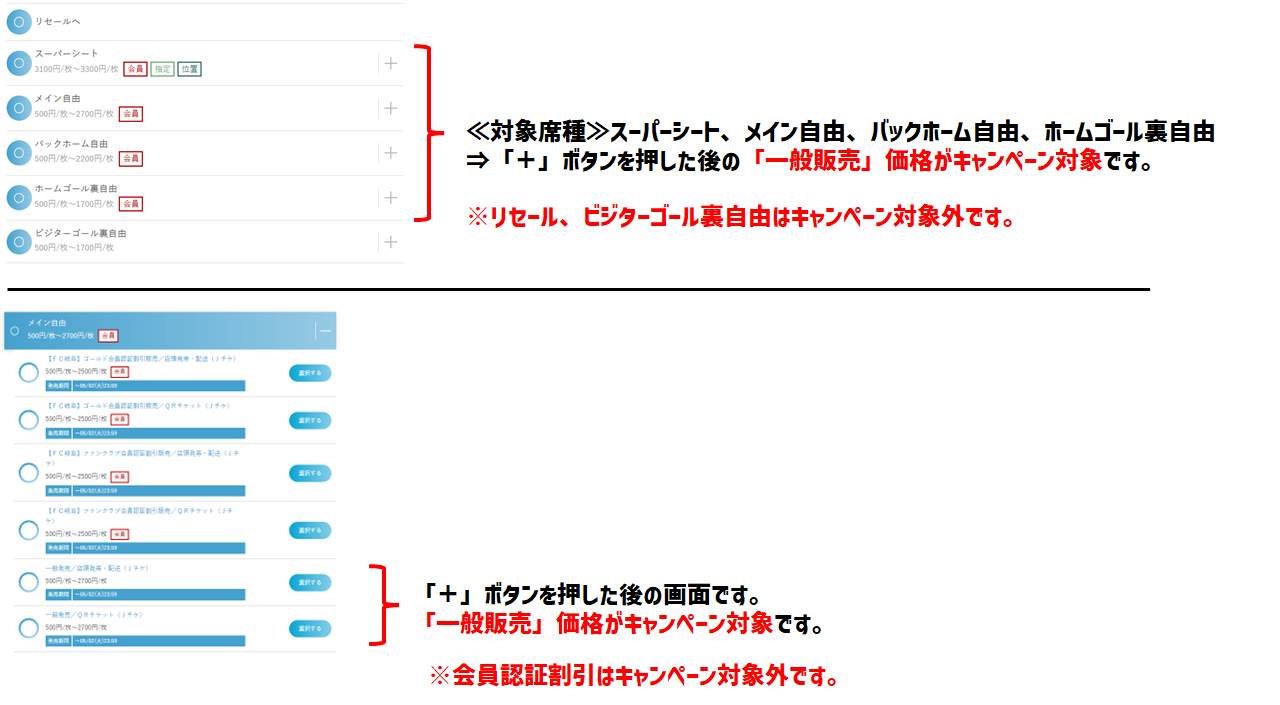 ※ファンクラブ会員認証販売/小中高/ビジターゴール裏自由をお買い求めいただいた方は、ご返金の対象外です。
