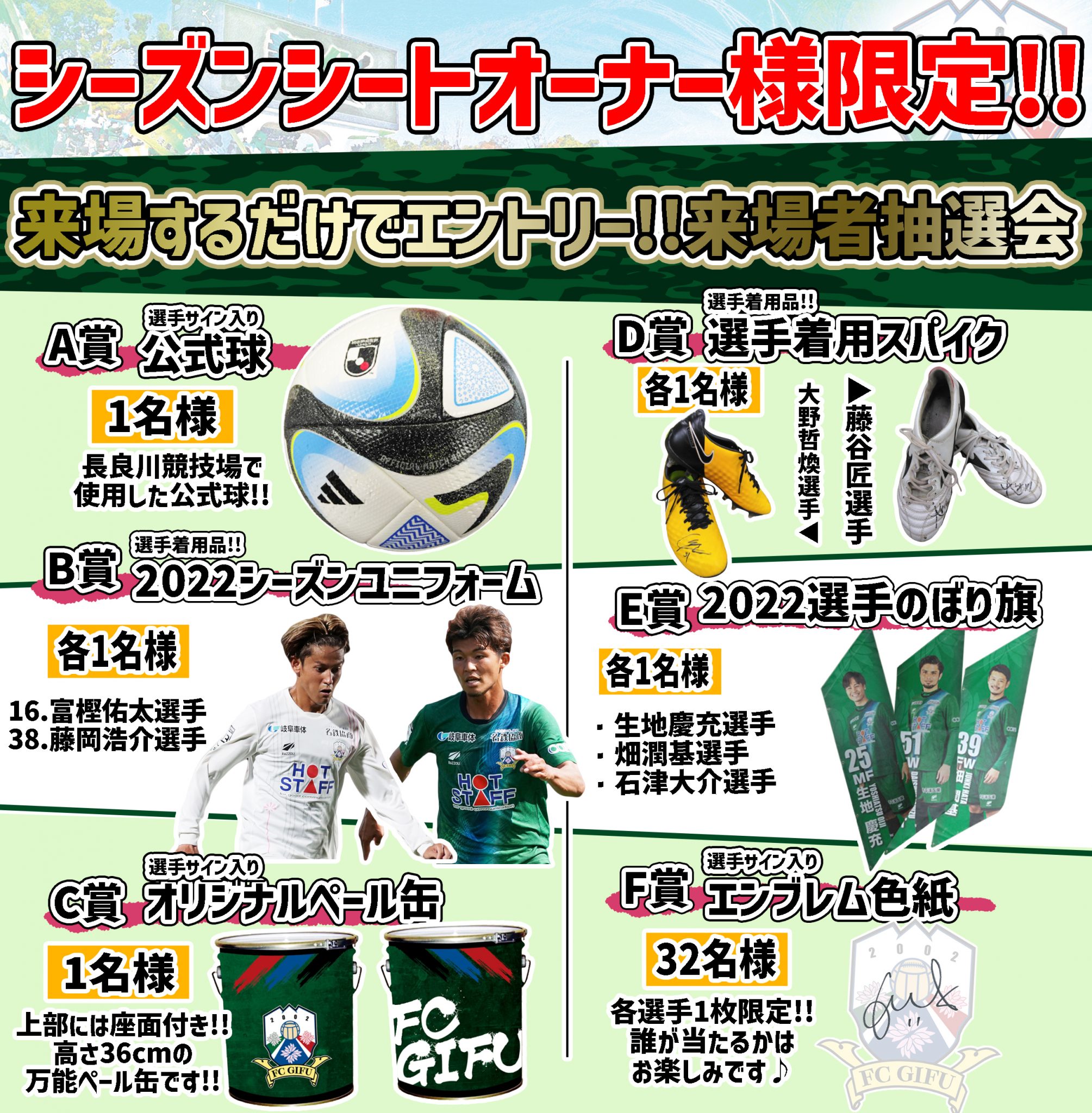 ※当日の並び順はくじ引きで決定いたします。FC岐阜側、アウェイチーム側の2列にわかれ、選手入場の両サイドにお並びいただきますのでご了承ください。