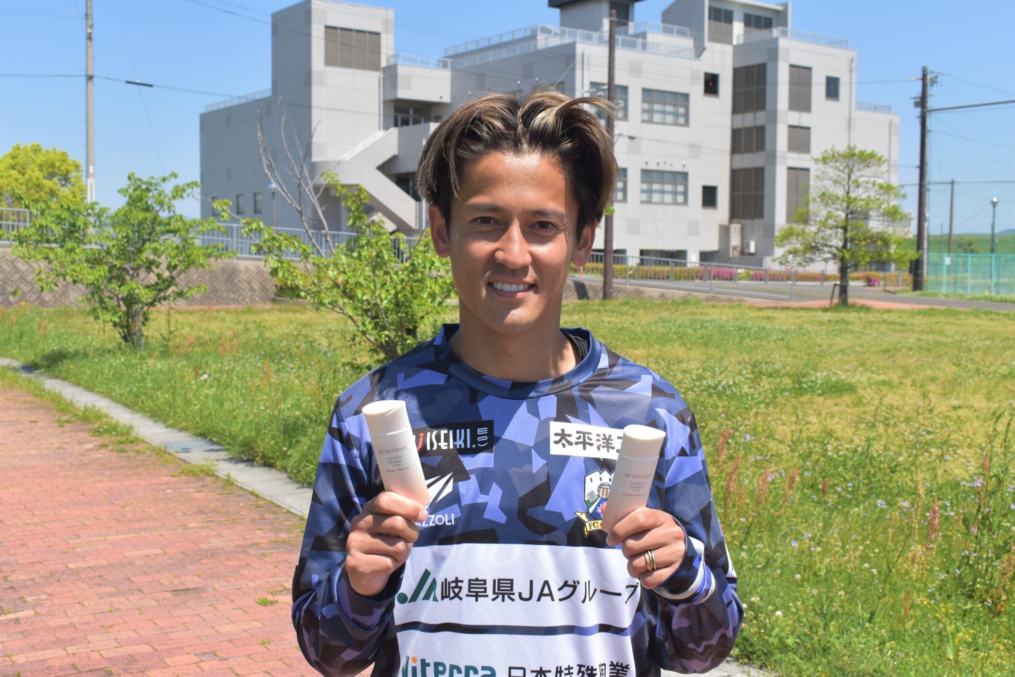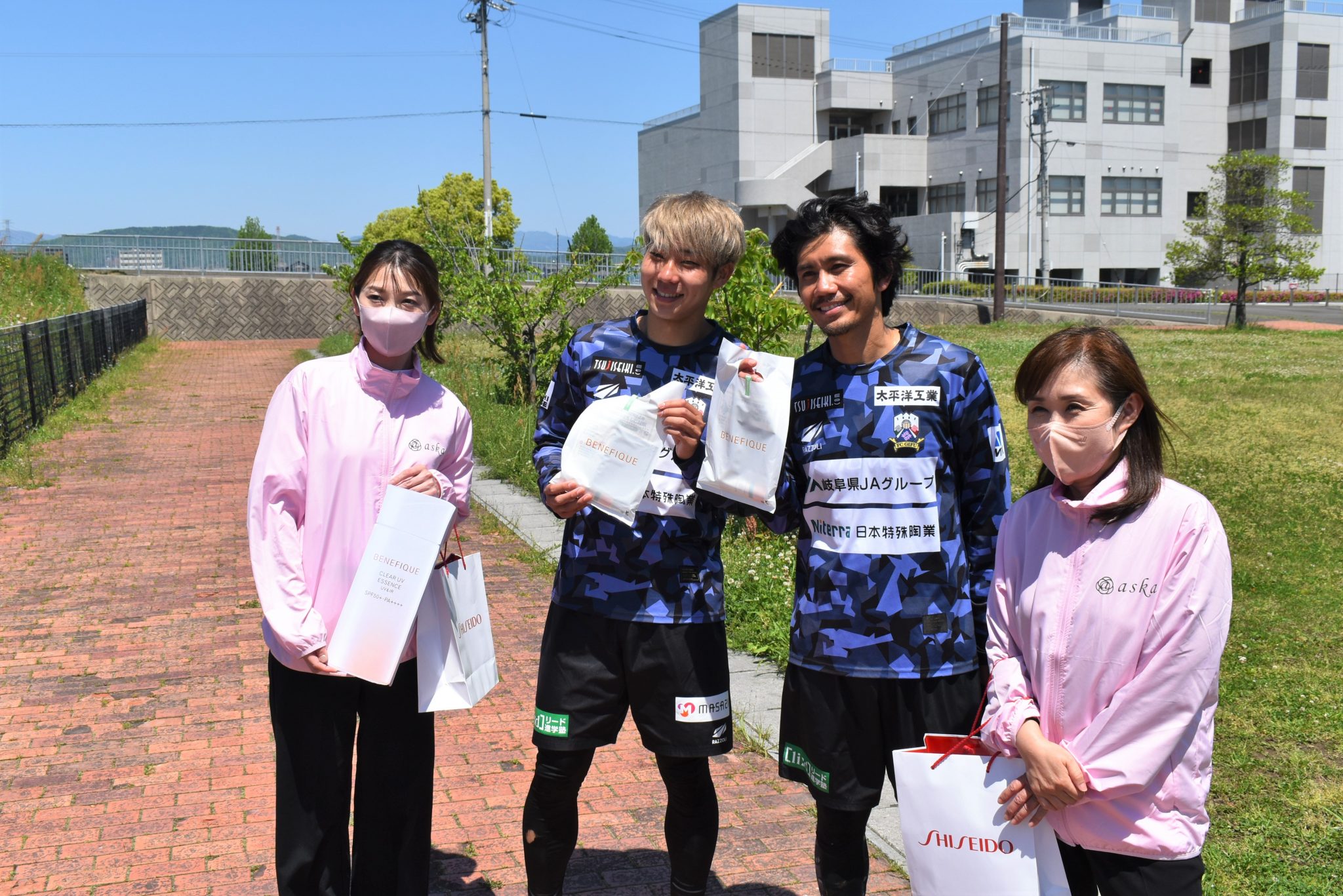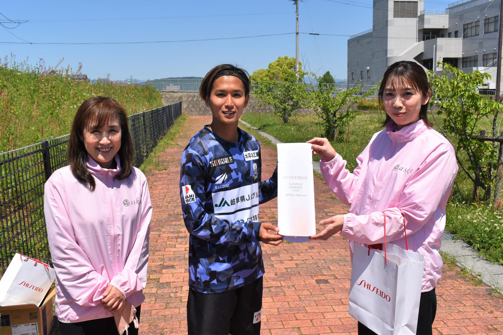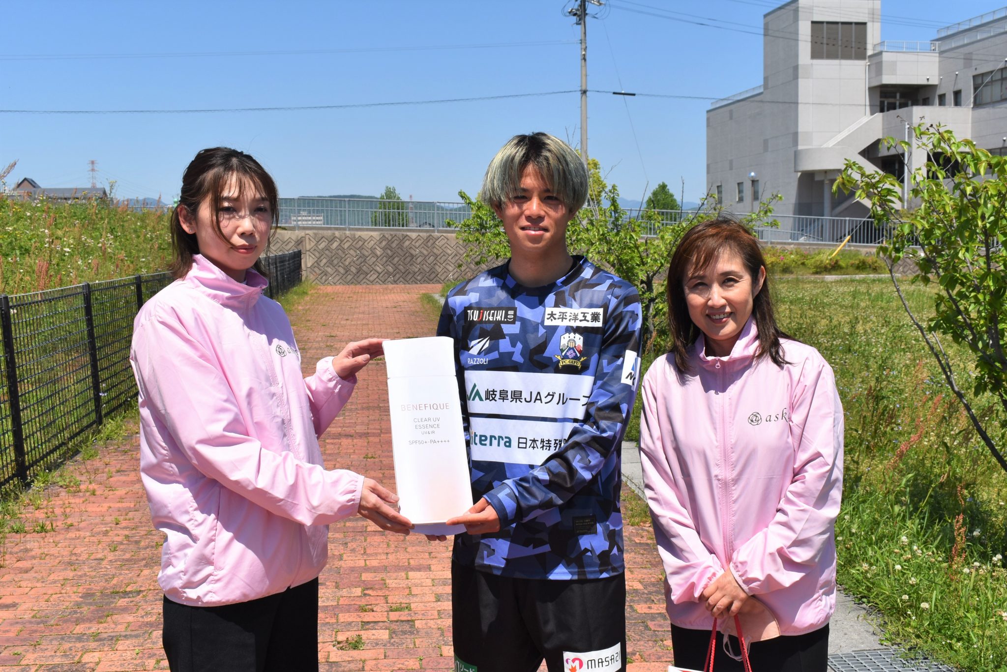 4月27日(木)北西部運動公園にて、オフィシャルパートナーである化粧品専門店あすか様より資生堂「ベネフィーク クリアUVエッセンス(日焼け止め用美容液)」をFC岐阜トップチームの全選手へ贈呈いただきました。