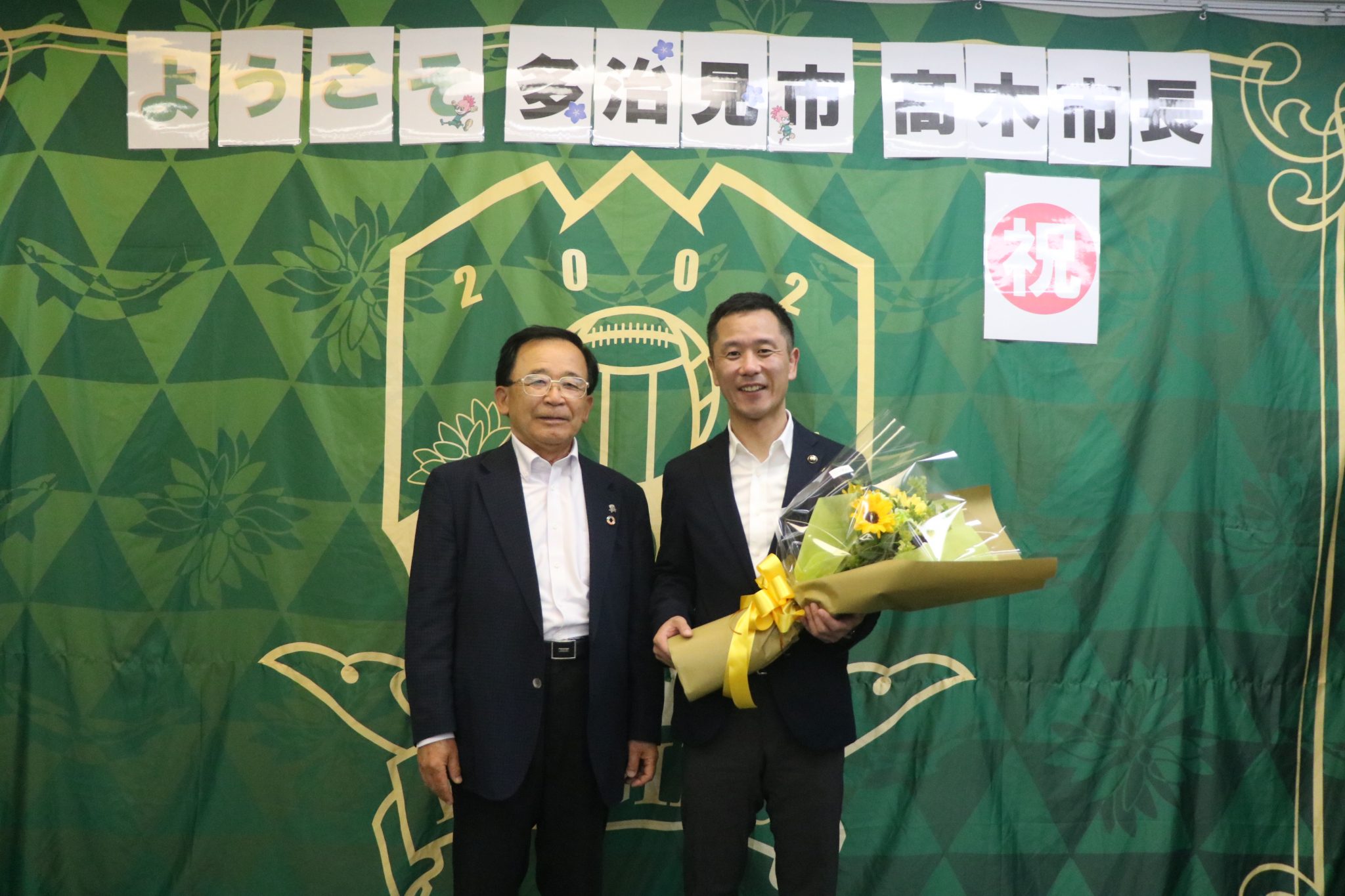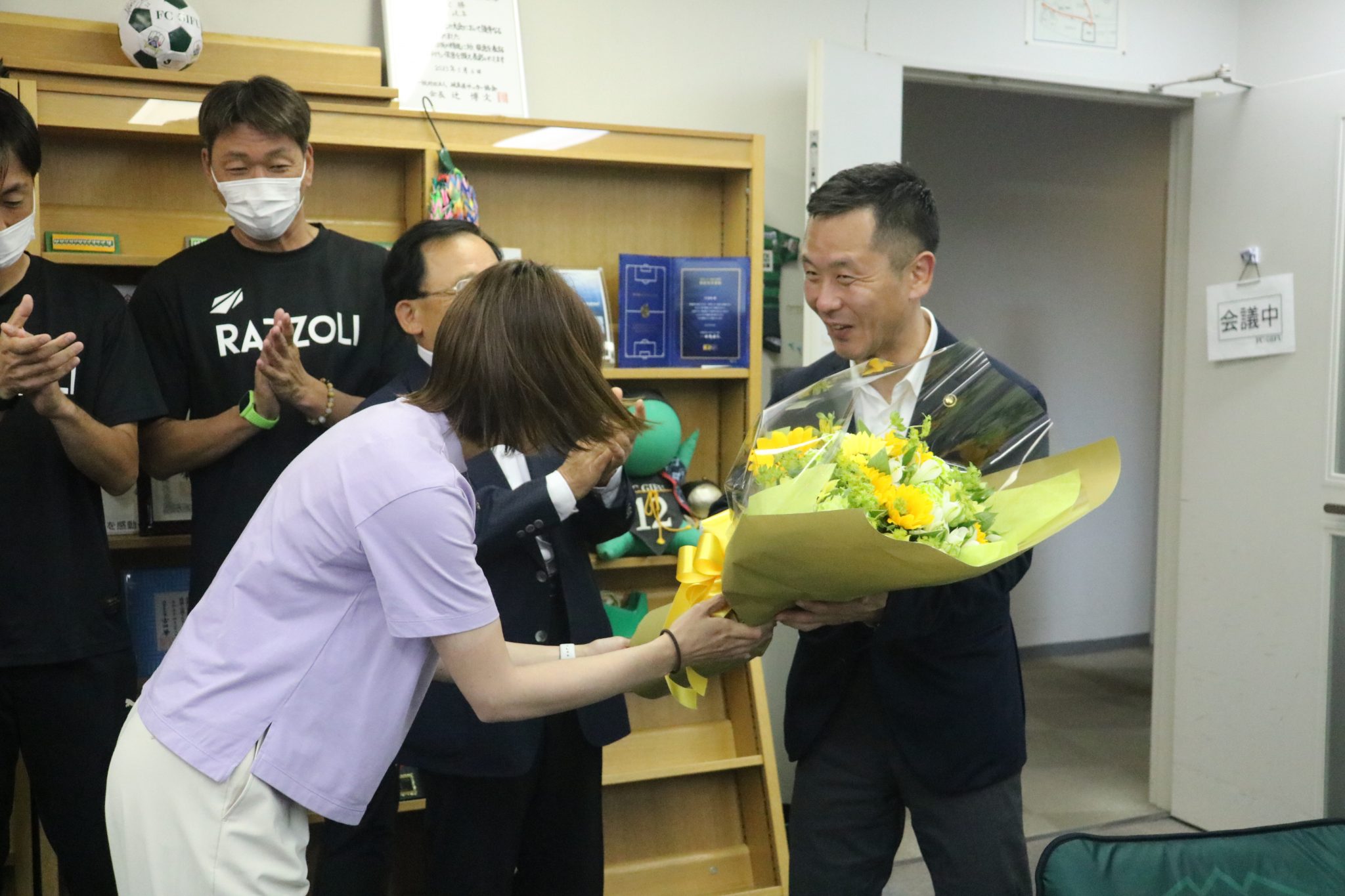 宮田会長より、「FC岐阜の元選手が様々な分野で活躍されていることは、とても嬉しく思い、FC岐阜の誇りです」と市長就任のお祝いをお伝えし、お花を贈呈いたしました。