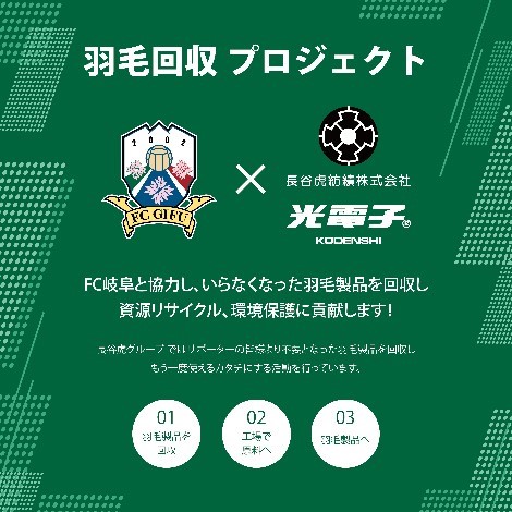FC岐阜のオフィシャルパートナーである、長谷虎グループ様ではSDGs活動の一環として羽毛製品の回収、リサイクルを行っております。ダウンジャケットや羽毛布団などの不要になった羽毛製品を回収し、最新の技術で洗浄、再度羽毛を使用できる状態にします。